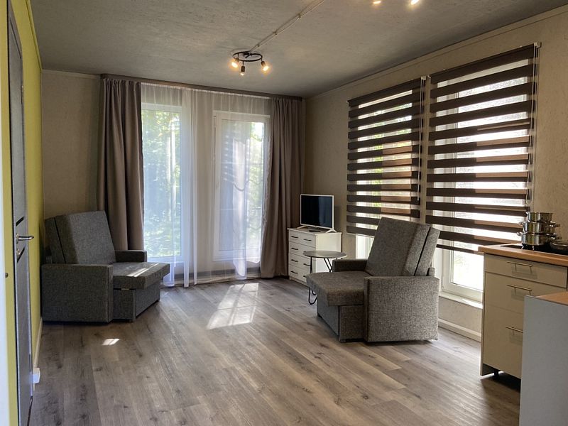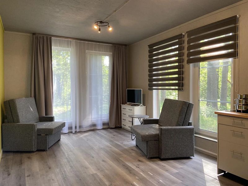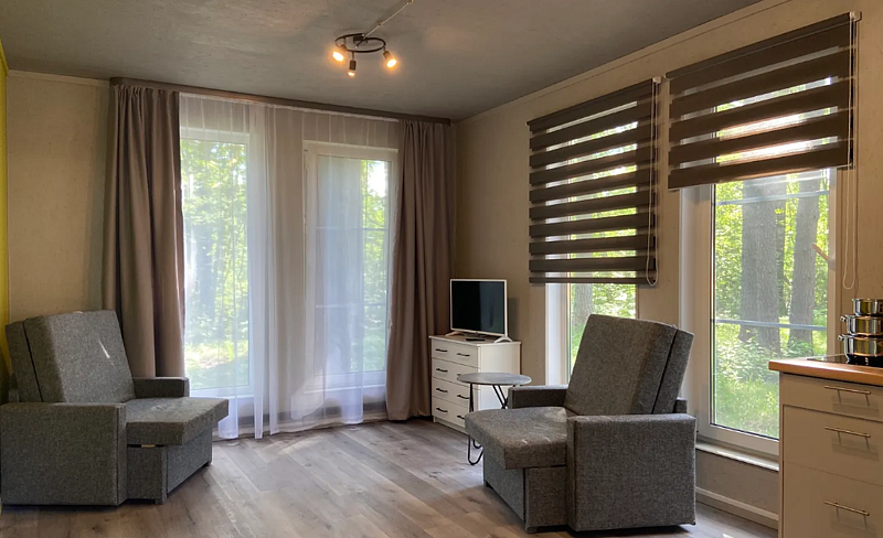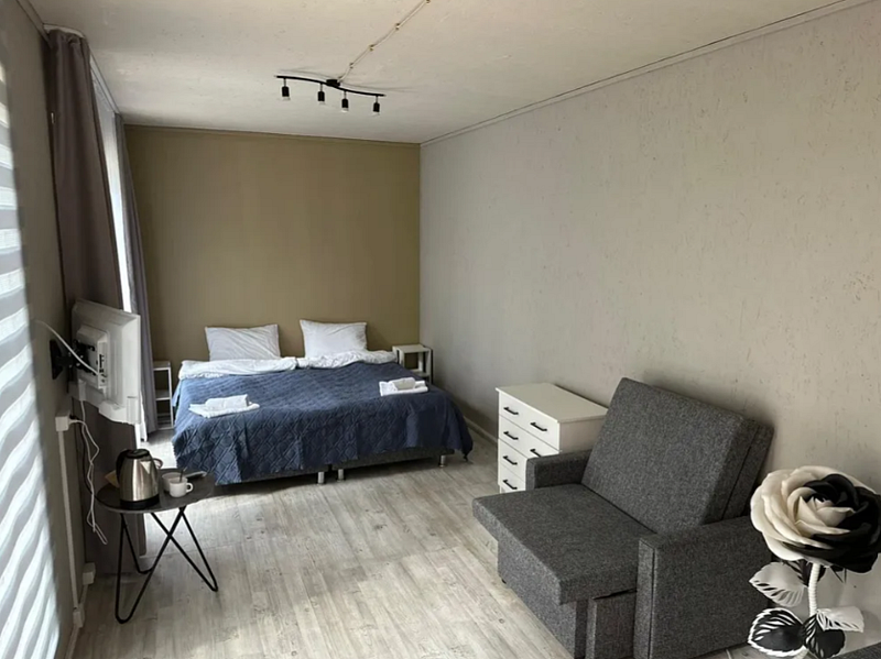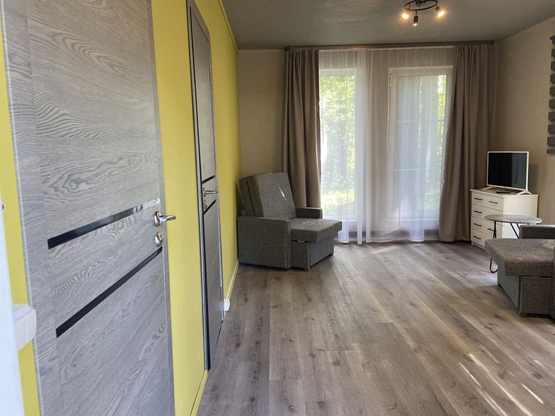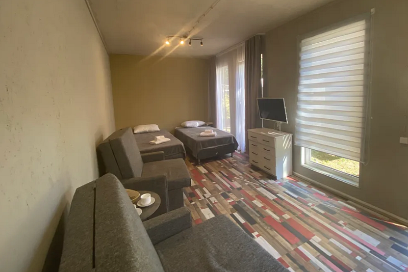 двуспальная кровать, 2 кресла-кровати, ТВ, с/у, душ, кухонный уголок