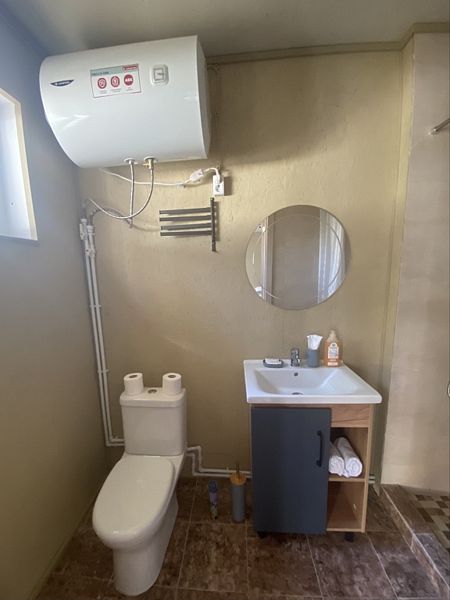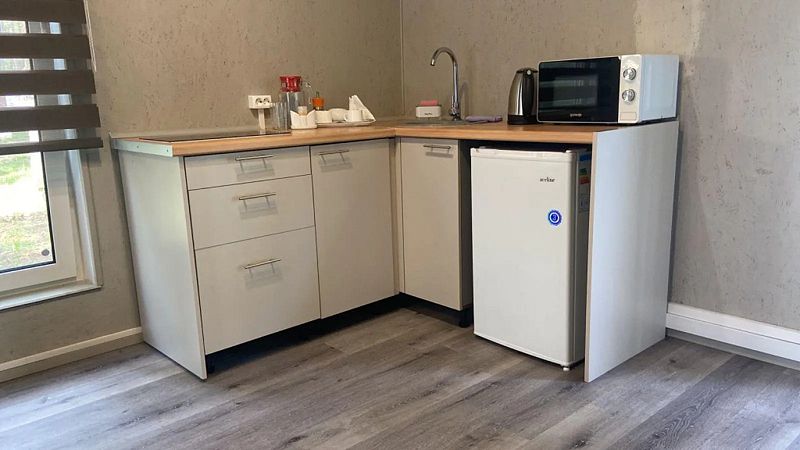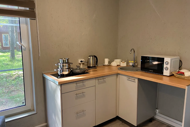 Домик на 4 человека с собственным санузлом, кухней и террасой. Постельное белье, полотенца и чайник, мангал предоставляются.