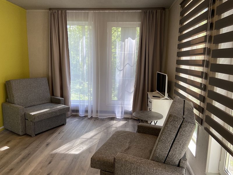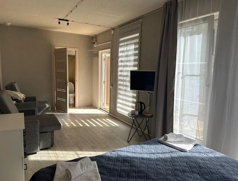 Номер со всеми удобствами, с двуспальной кроватью, отдельным выходом на террасу с уличной мебнлью.