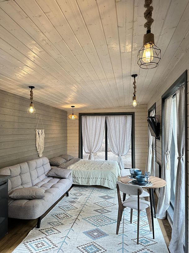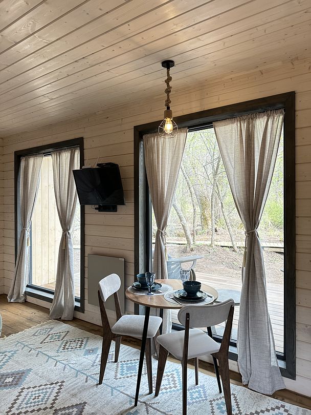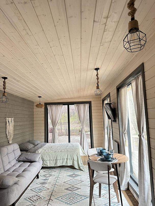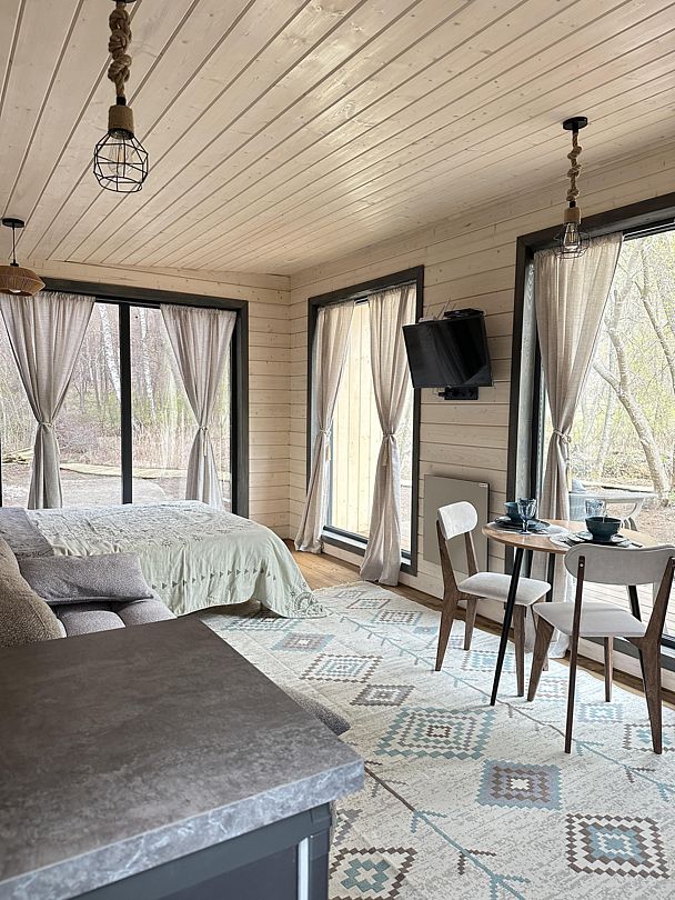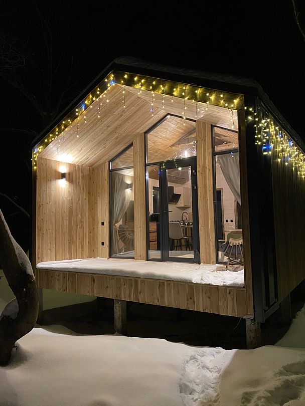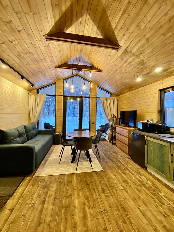 Здесь вас ожидают просторные и уютные дома с отоплением, продуманные в мельчайших деталях. Благодаря панорамному остеклению вы в любое время сможете насладиться захватывающим видом на лес и окружающие горы.