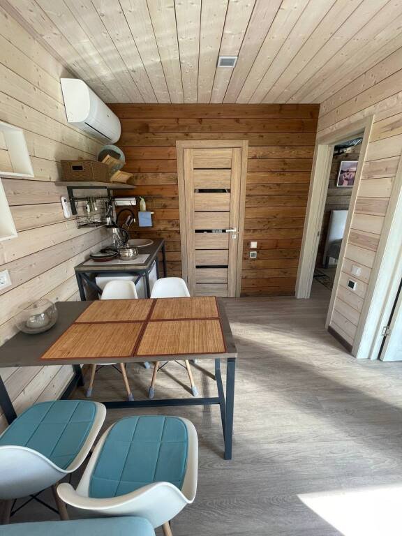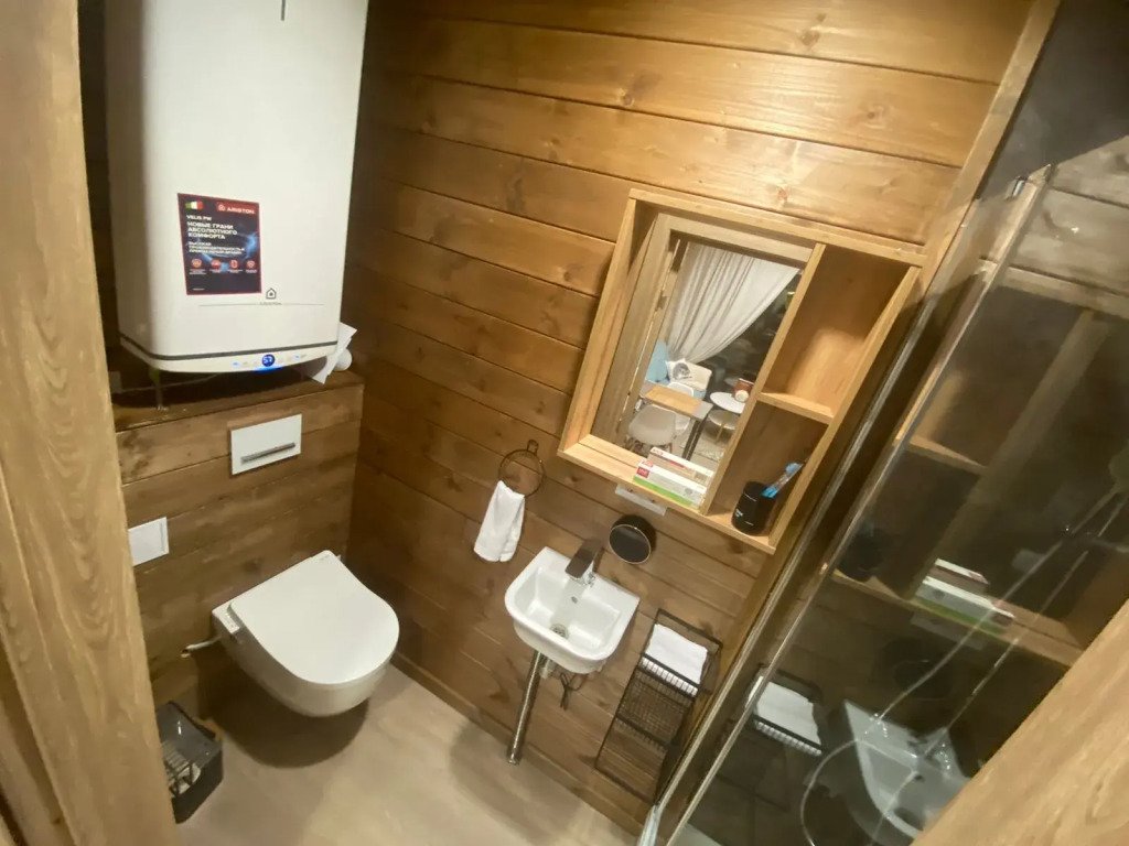 В домах панорамные окна, Wi-Fi, тёплые полы, кондиционер. На кухне имеются: чайник, кухонная плита, холодильник, посуда, раковина. Санузел с душевой кабинкой, душем с термостатом, феном, USD-зарядным устройством и электронной крышкой биде.
