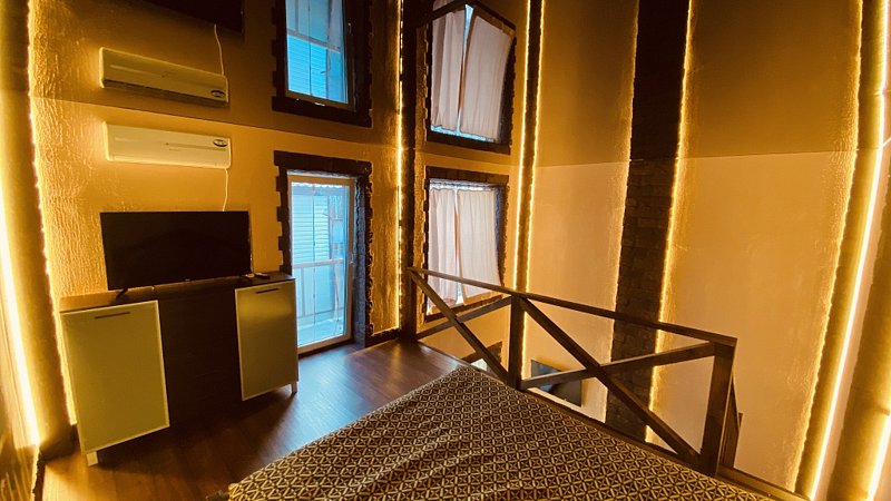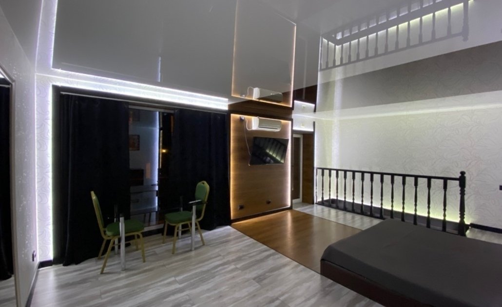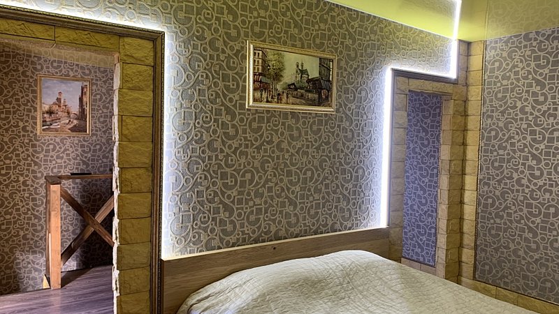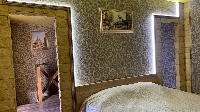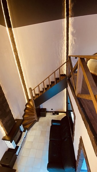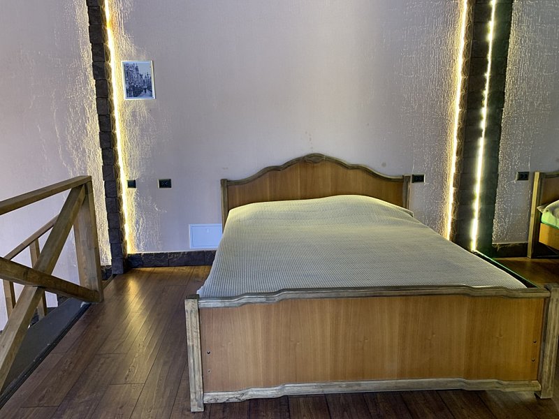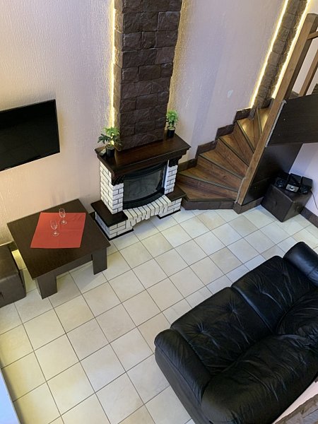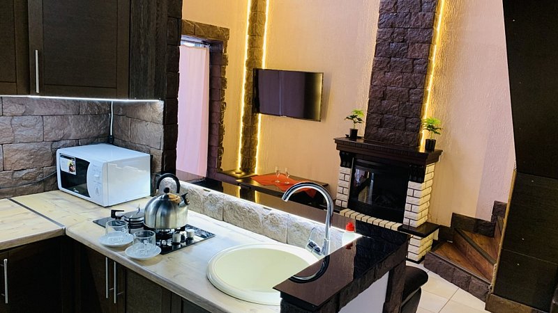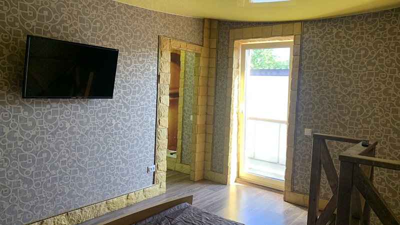 На первом этаже кухня-гостиная с кожаным диваном и телевизором, санузел. На втором этаже спальня с большой кроватью и выходом на балкон.