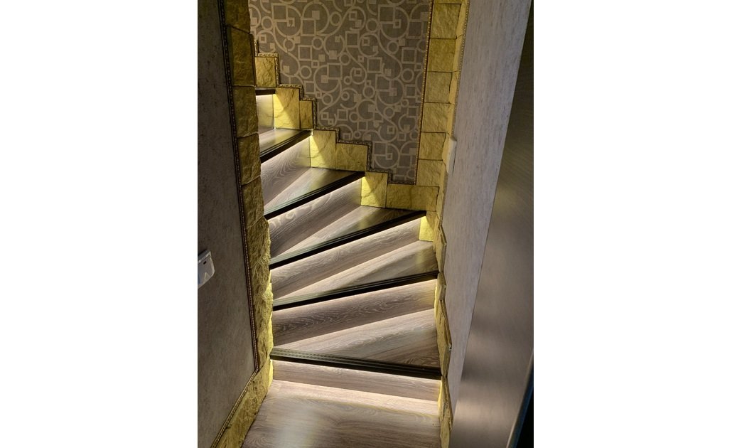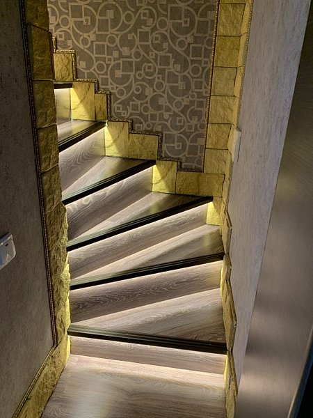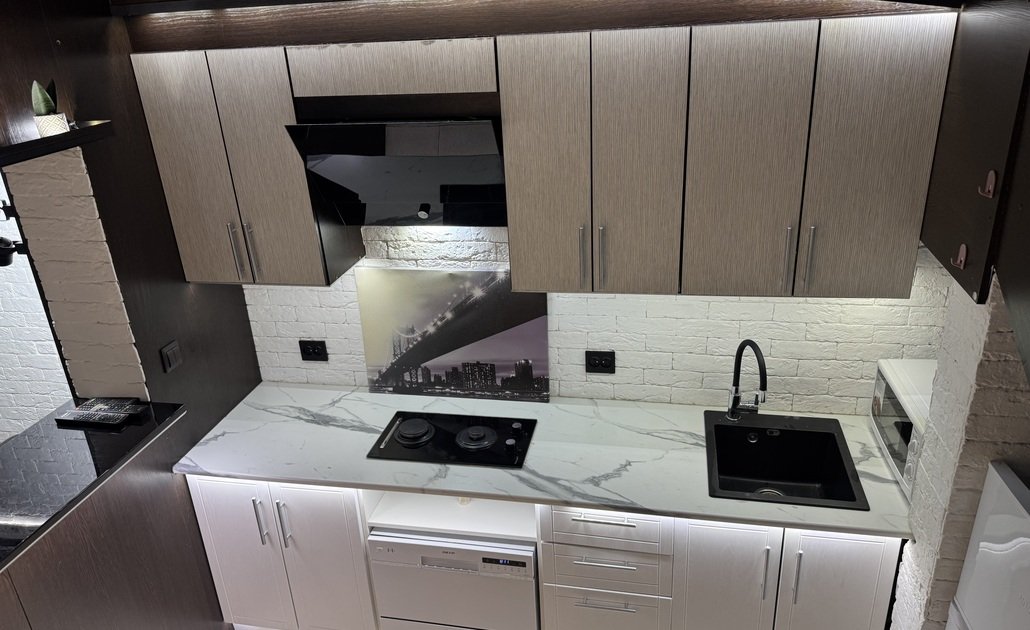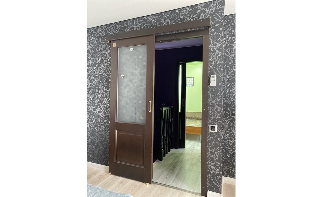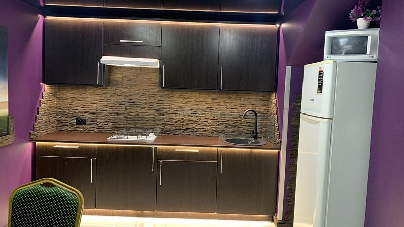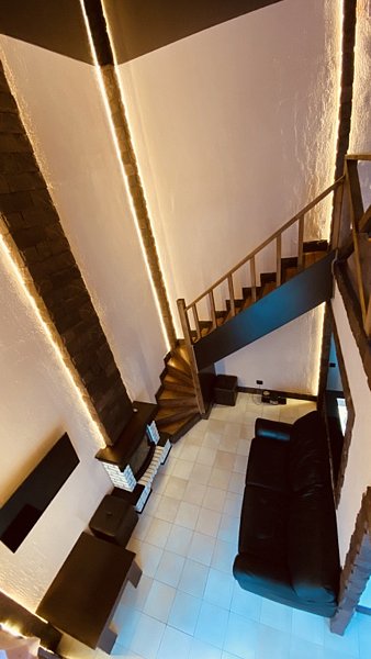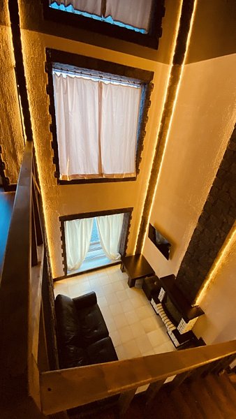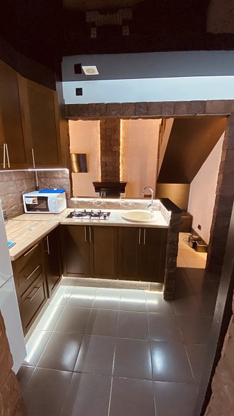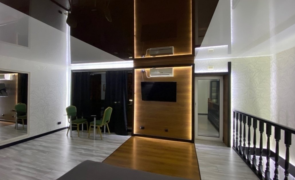 На первом этаже кухня-гостиная с кожаным диваном и телевизором, санузел. На втором этаже спальня с большой кроватью и выходом на балкон.