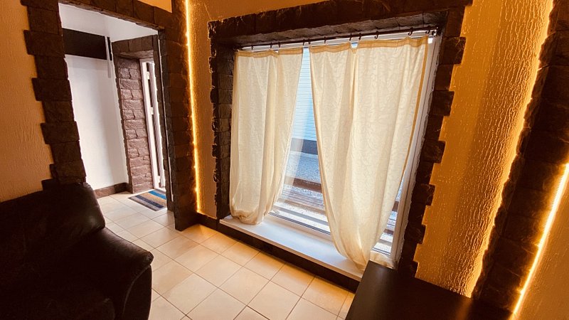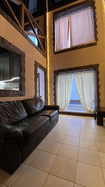 На первом этаже просторная кухня-гостиная с телевизором и раскладным кожаным диваном. На втором этаже две спальни, разделенные перегородкой без дверей . В доме все удобства для комфортного проживания.