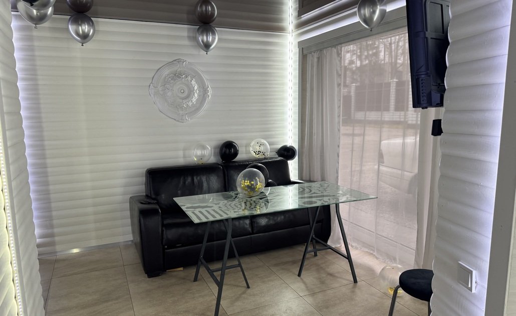 В доме два дивана и двуспальная парящая кровать с подсветкой. Горячая, холодная вода, газ, Санузел с душевой совместный. Большие панорамные окна.