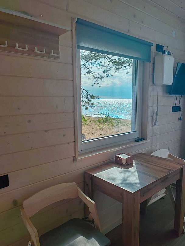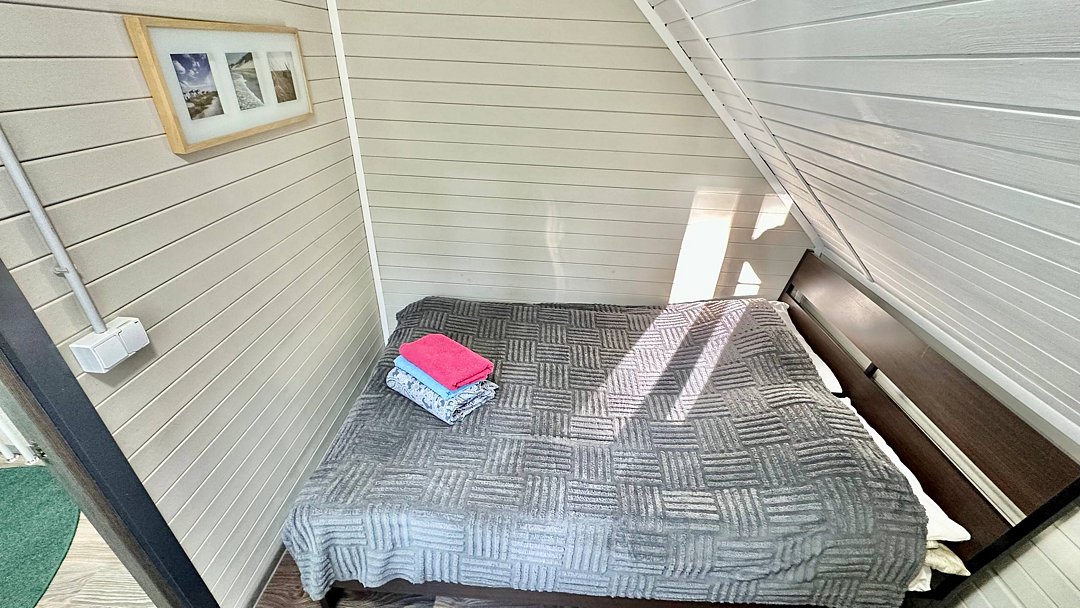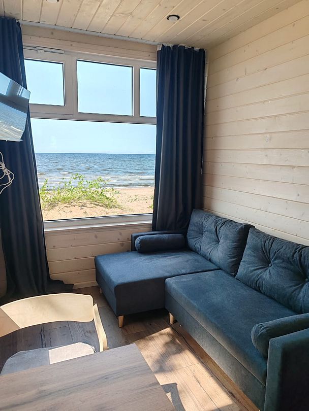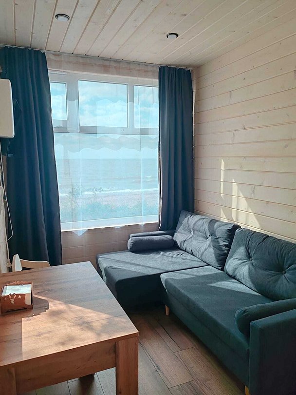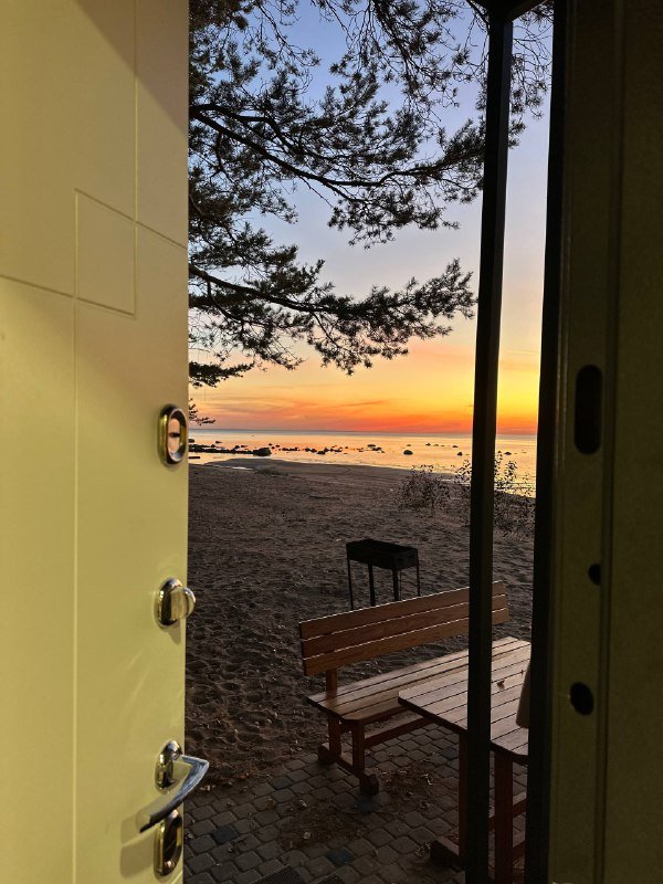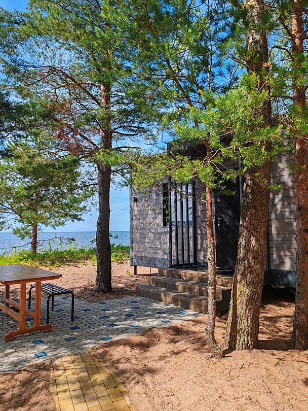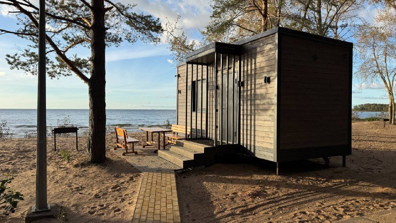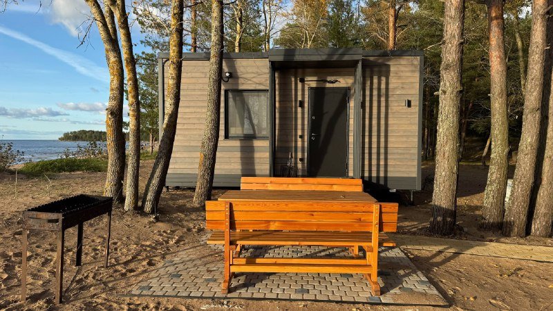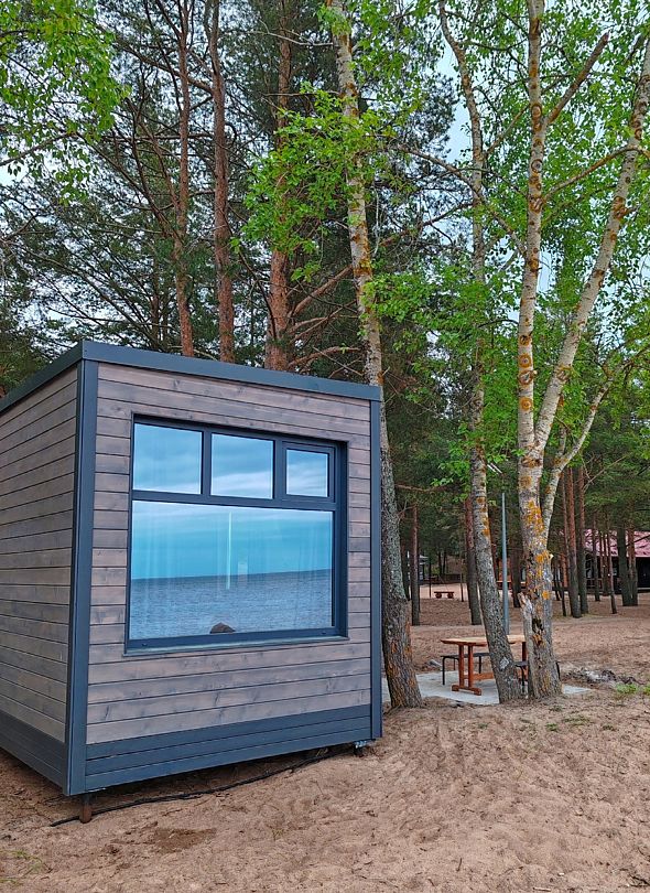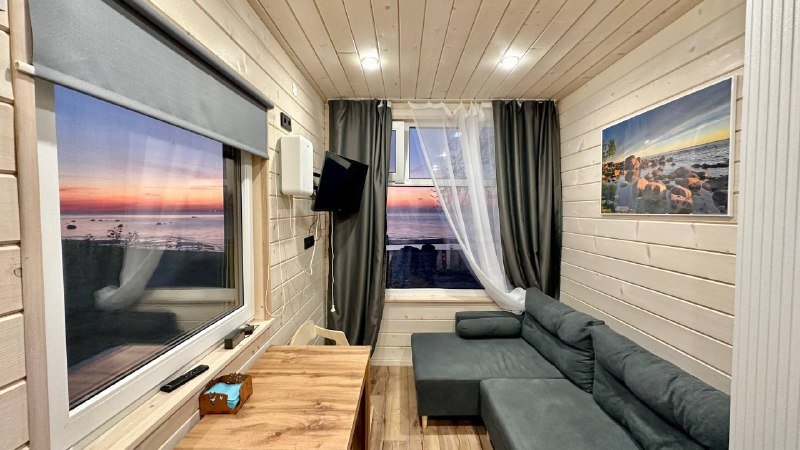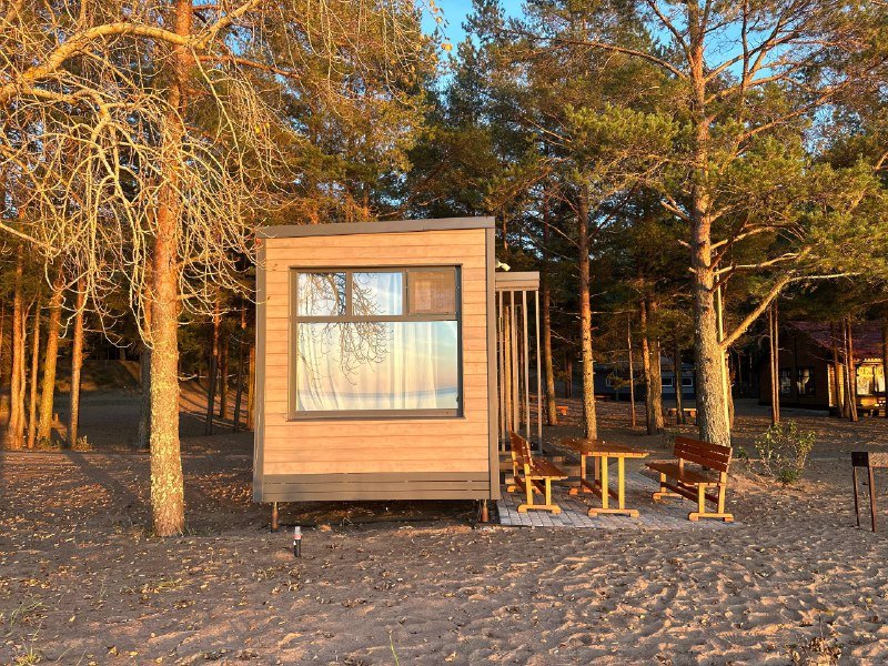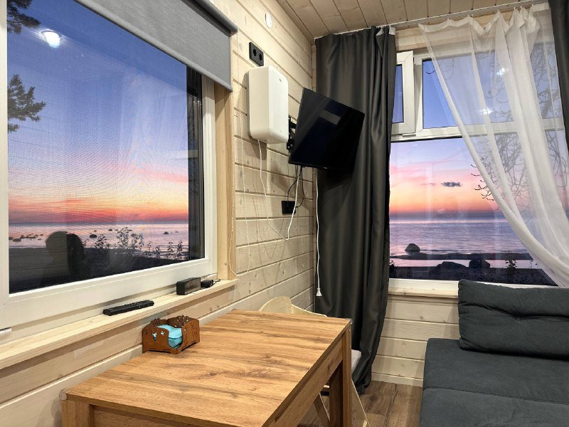 Уютный коттедж «Закат» на первой береговой линии финского залива с панорамным окном. Для двоих. Спальная и кухонная зоны, отдельный санузел с душем.