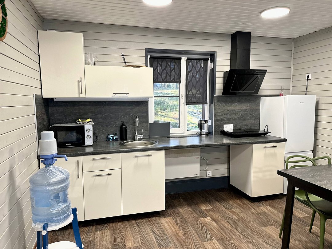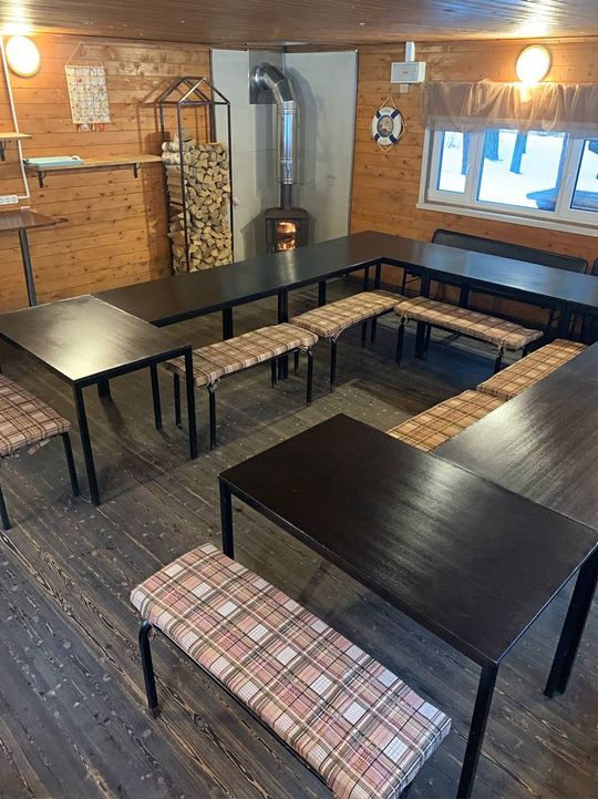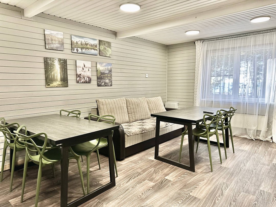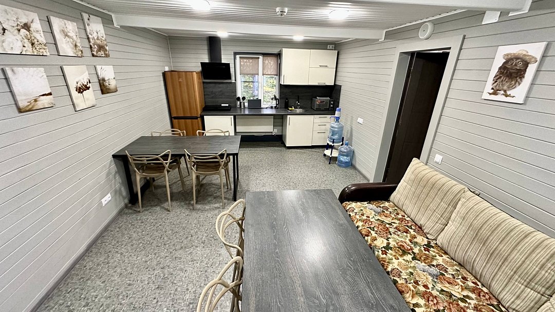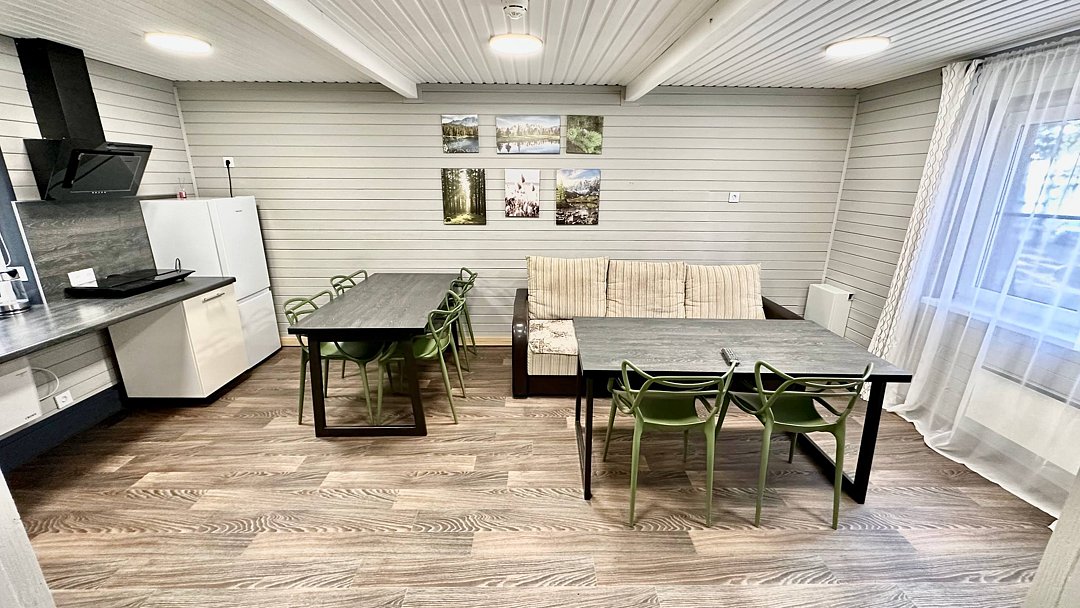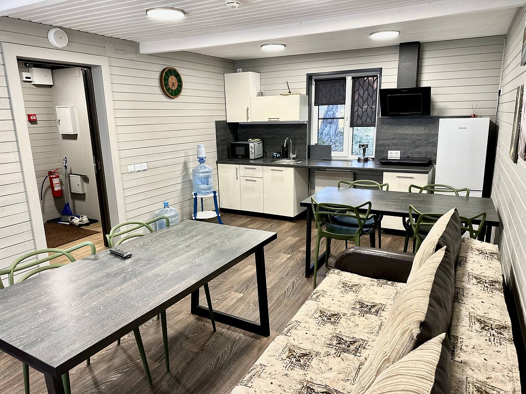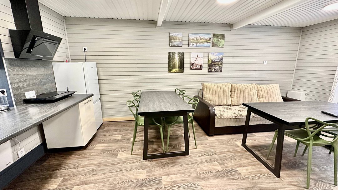 Зона для проведения мероприятий в ней находятся три обеденных стола, 6 лавочек, ТВ. Кухня оснащена холодильником, микроволновой печью, чайником, посудой на 10 персон.