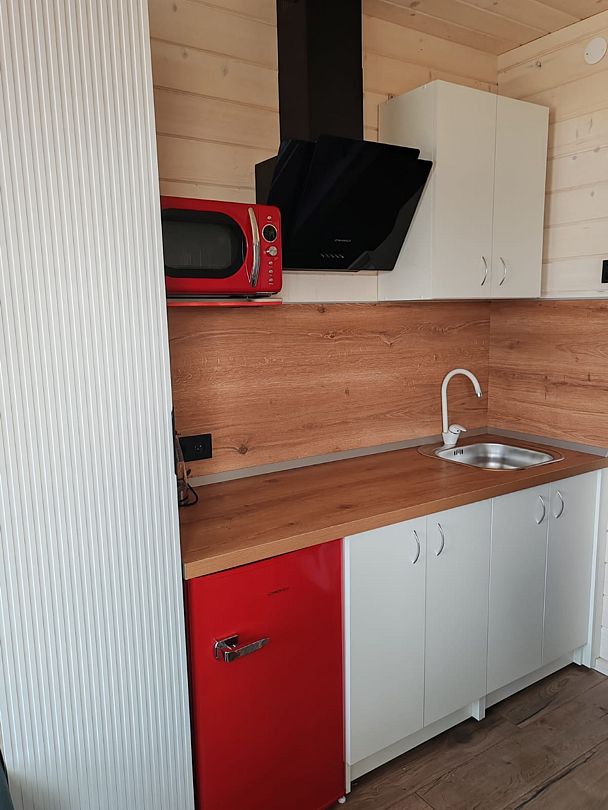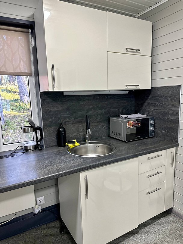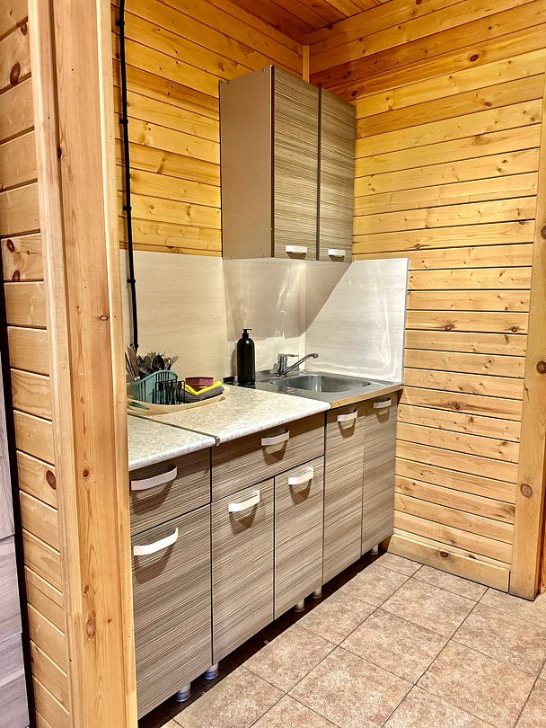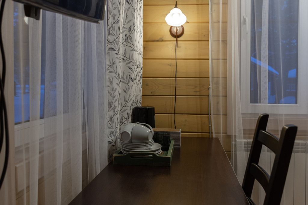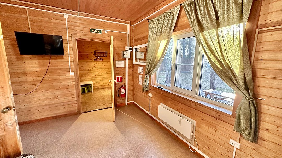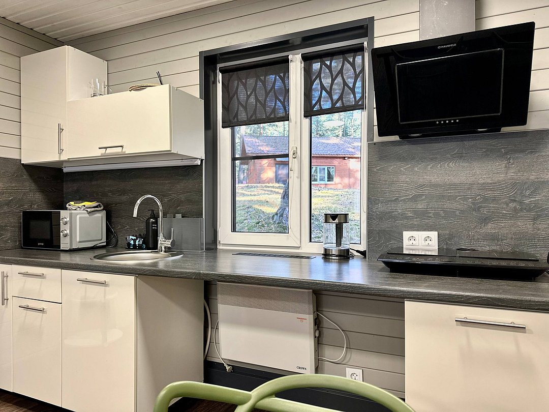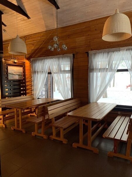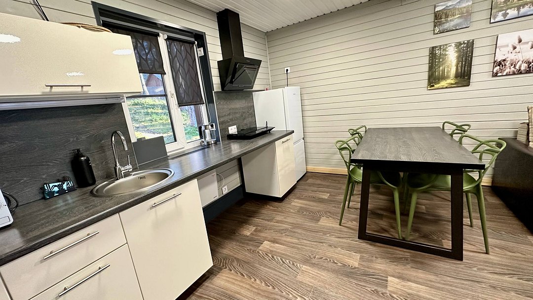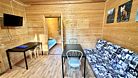 Зона для проведения мероприятий в ней находятся три обеденных стола, 6 лавочек, ТВ. Кухня оснащена холодильником, микроволновой печью, чайником, посудой на 10 персон.