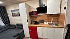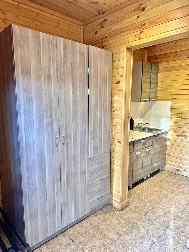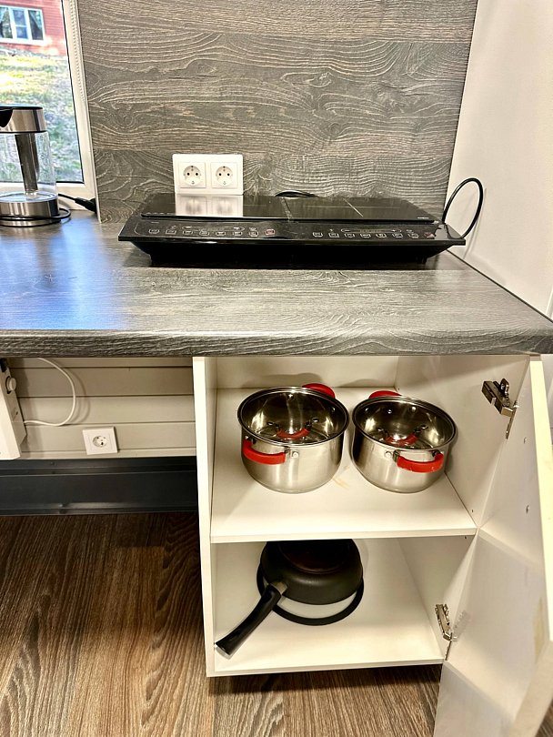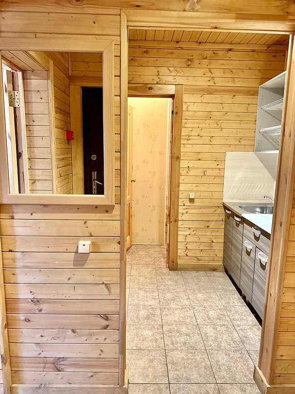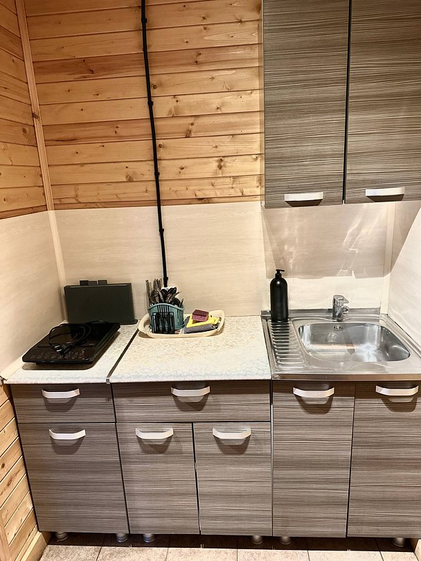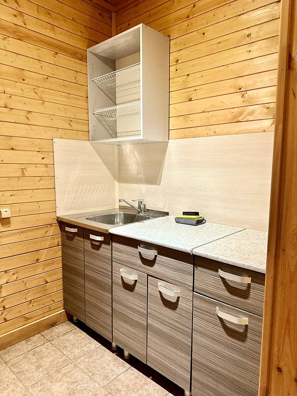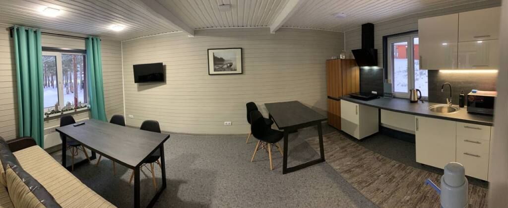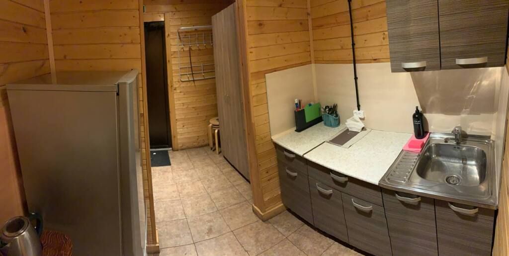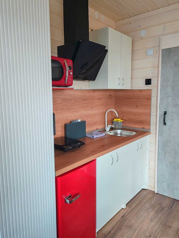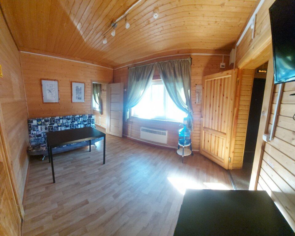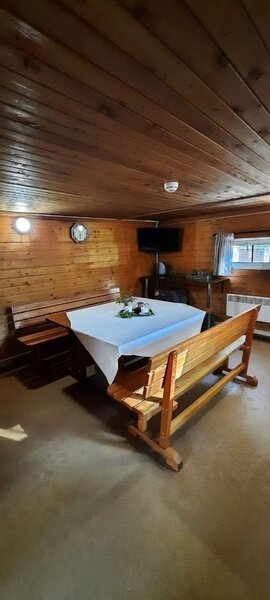 Зона для проведения мероприятий в ней находятся три обеденных стола, 6 лавочек, ТВ. Кухня оснащена холодильником, микроволновой печью, чайником, посудой на 10 персон.