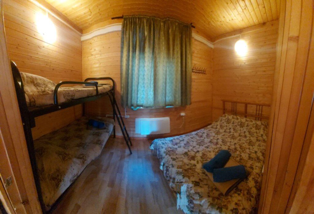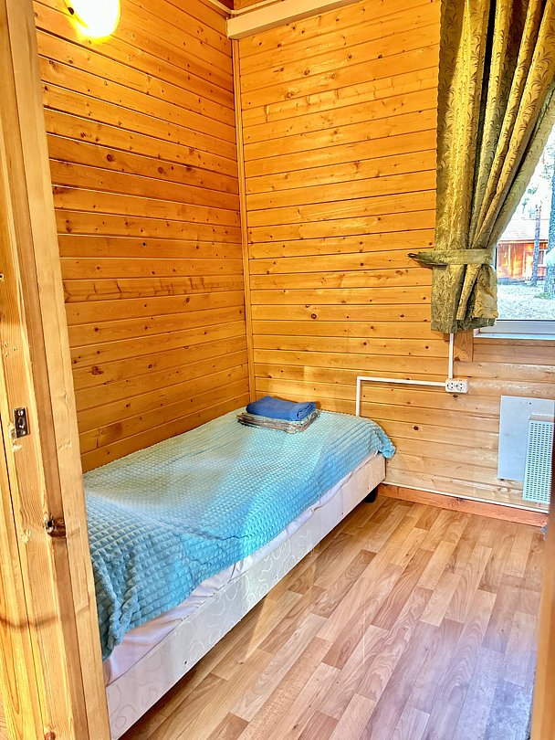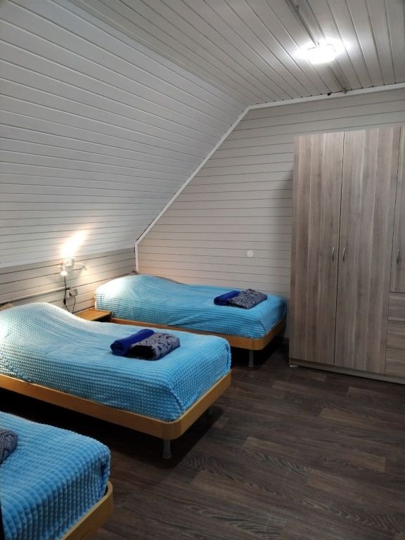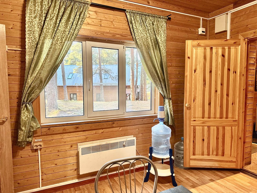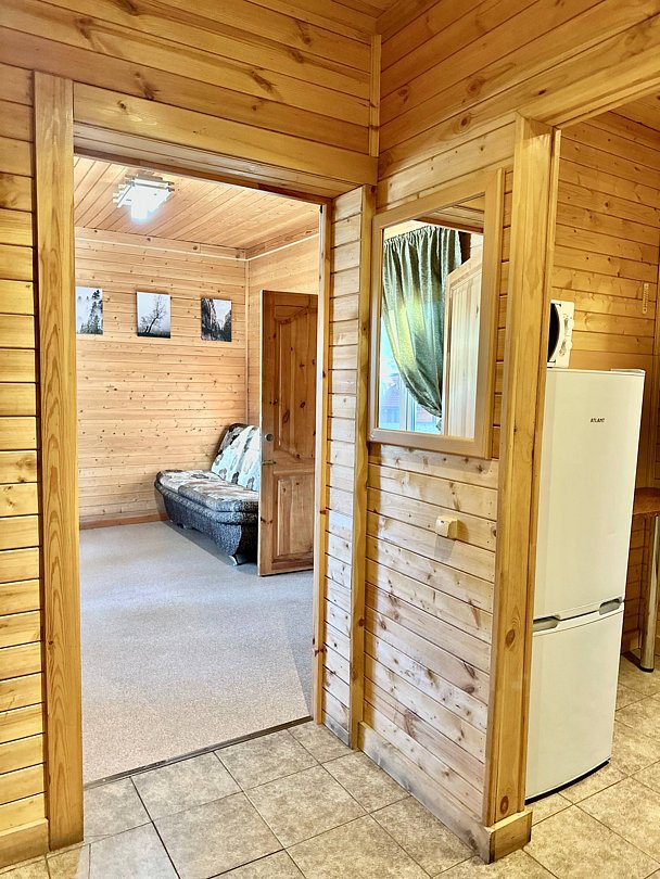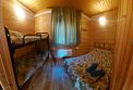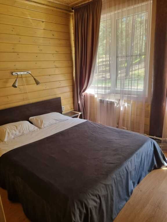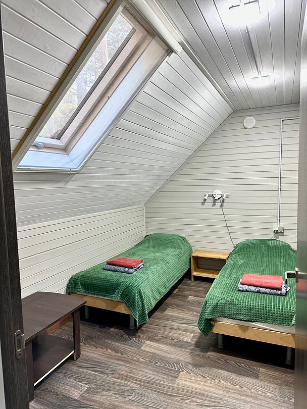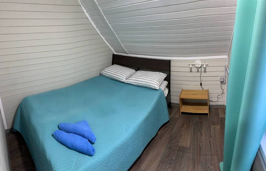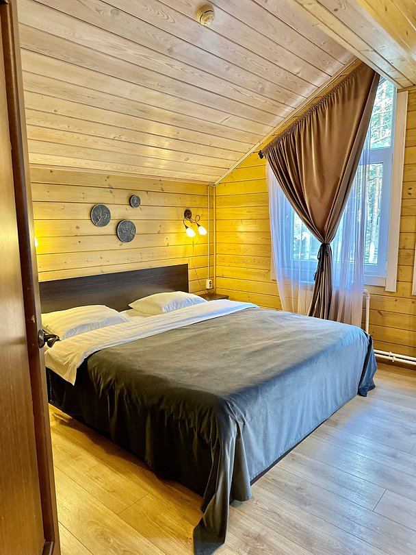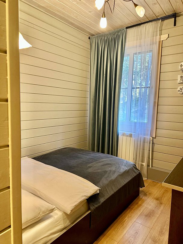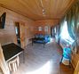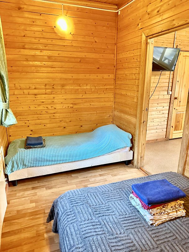 Двухэтажный деревянный коттедж-рассчитан на 10 мест (одна двухспальная и восемь односпальных кроватей). Оснащение коттеджа: постельное бельё, полотенце, санузел, холодная и горячая вода, кухня, набор посуды, СВЧ, мойка, большой обеденный стол, холодильник, чайник, TV. Рядом с коттеджем есть площадка с мангалом.