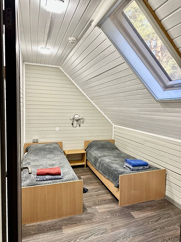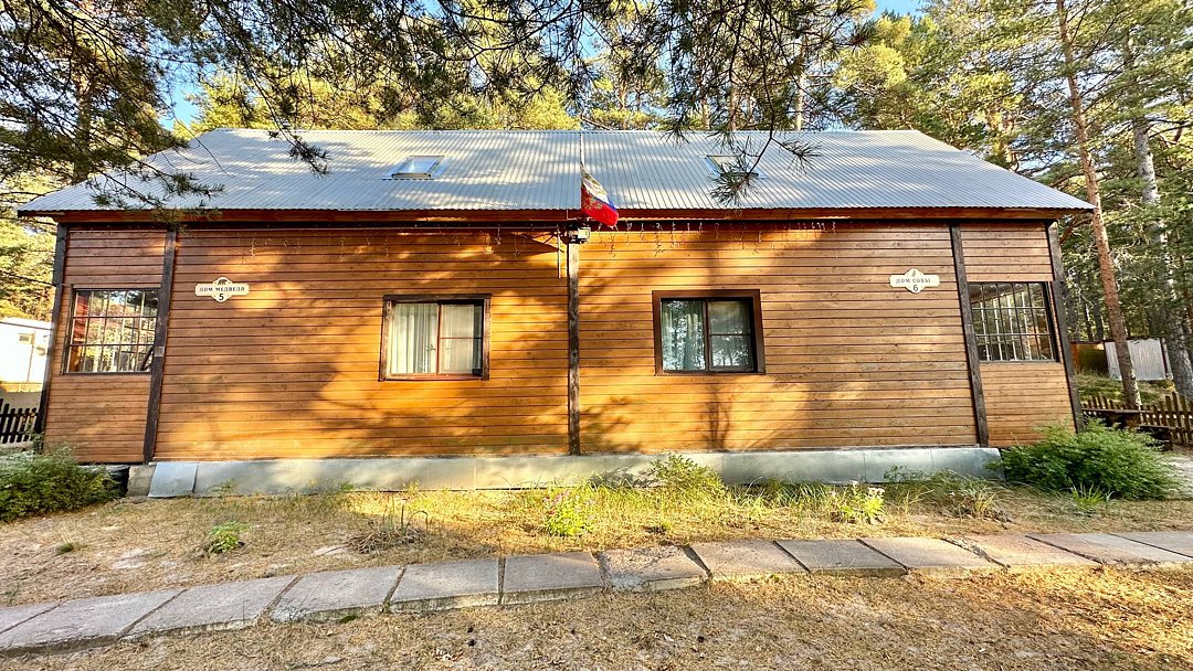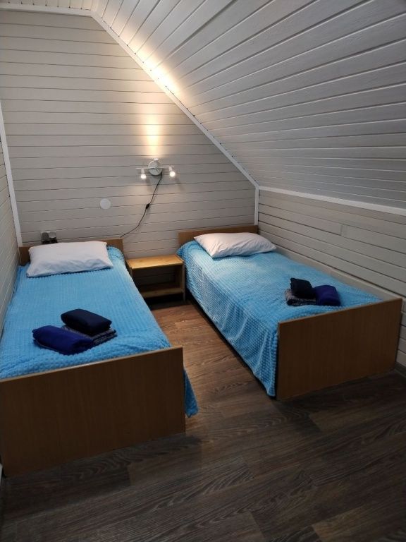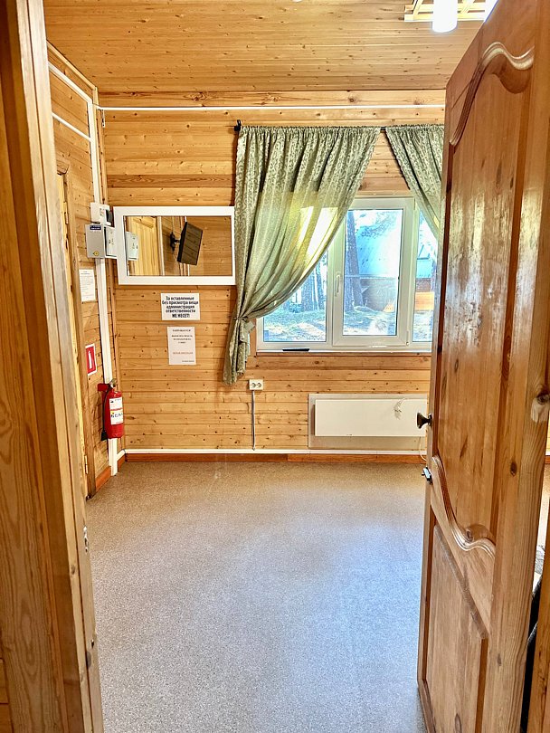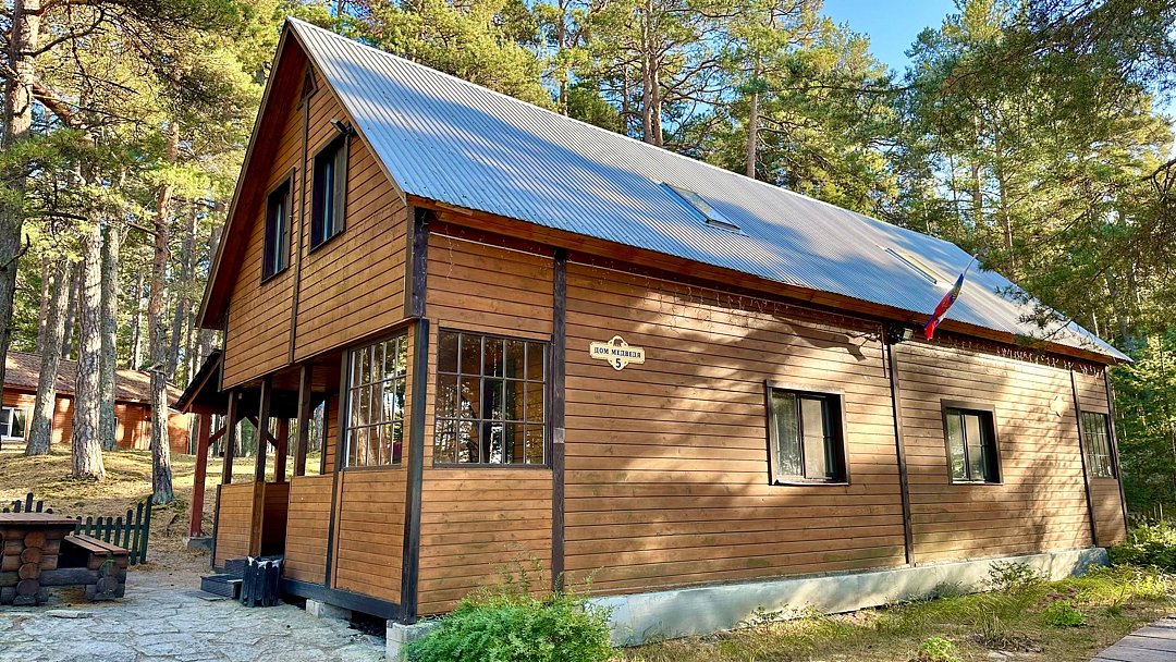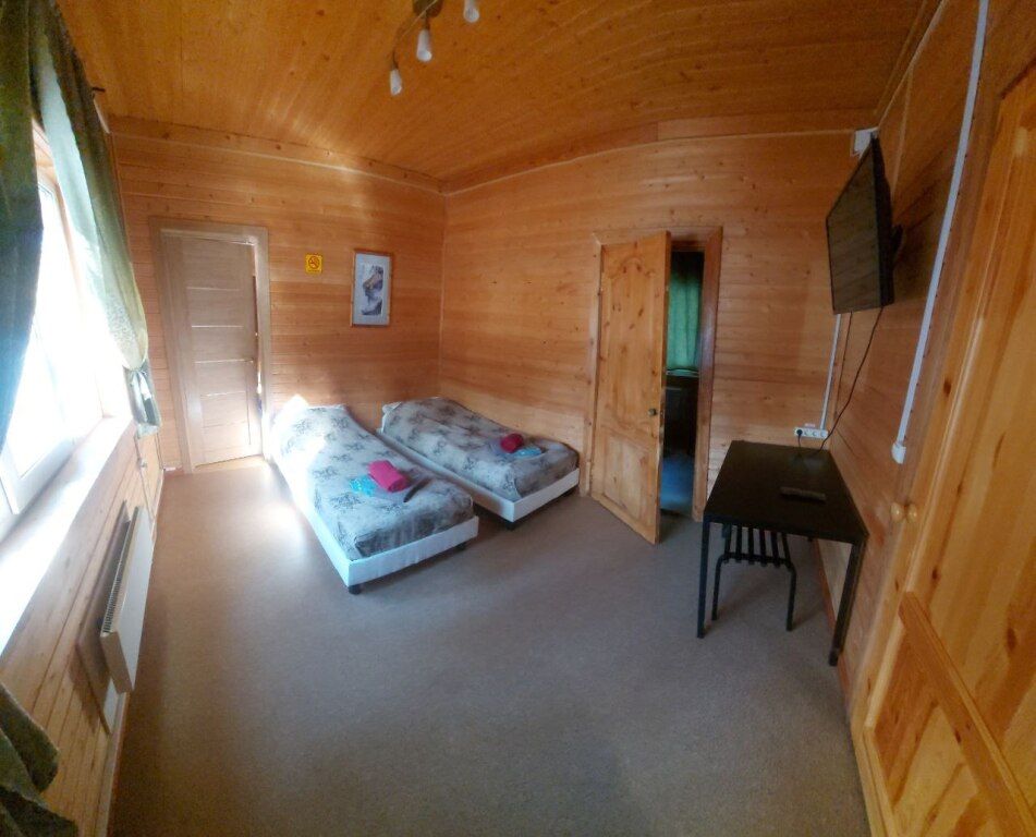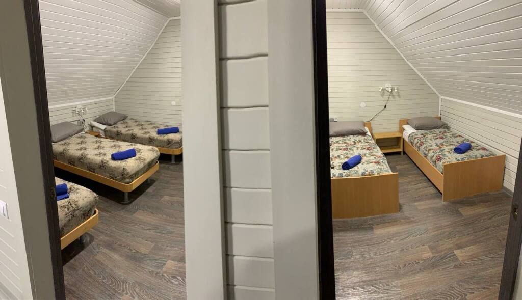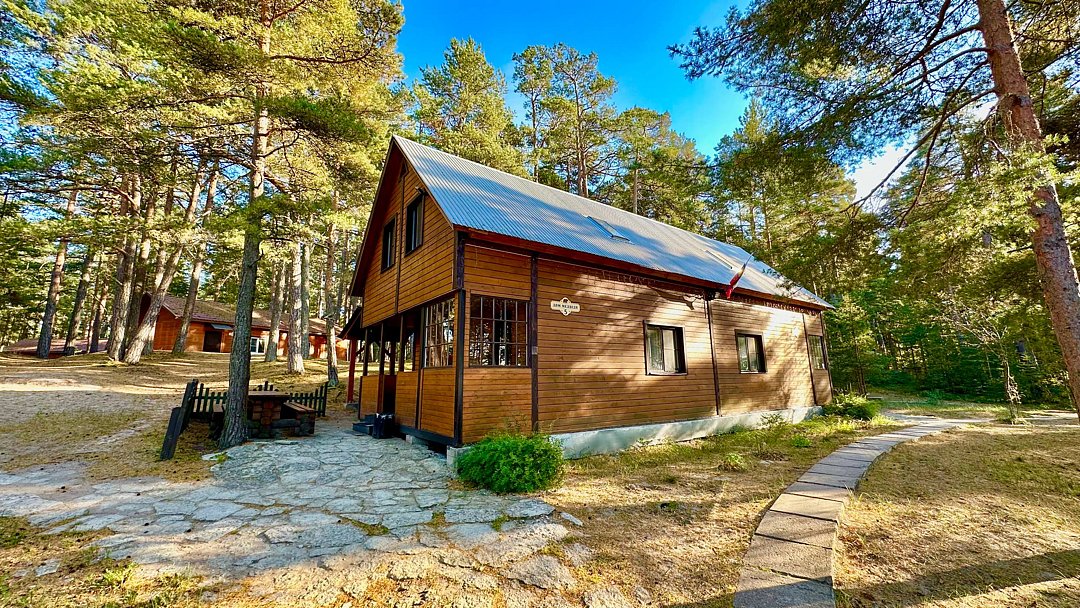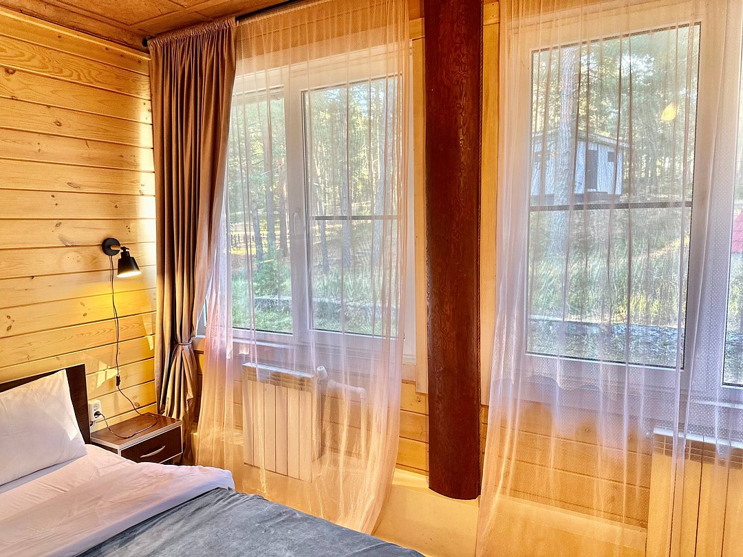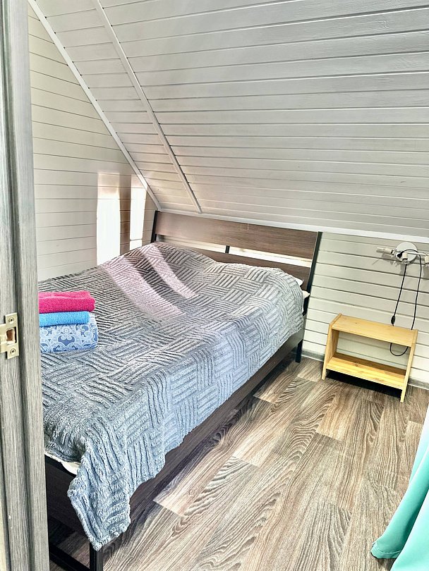 Двухэтажный деревянный коттедж-рассчитан на 10 мест (одна двухспальная и восемь односпальных кроватей). Оснащение коттеджа: постельное бельё, полотенце, санузел, холодная и горячая вода, кухня, набор посуды, СВЧ, мойка, большой обеденный стол, холодильник, чайник, TV. Рядом с коттеджем есть площадка с мангалом.
