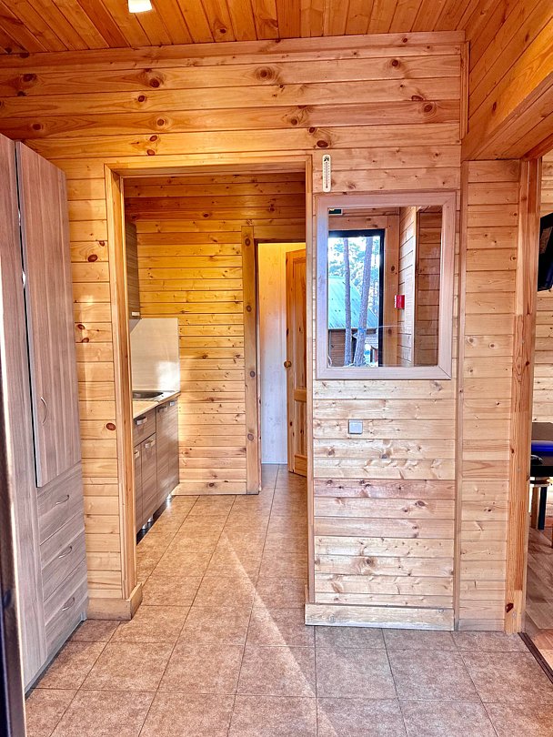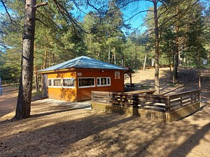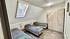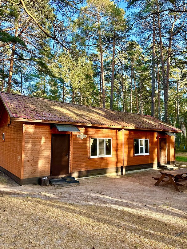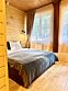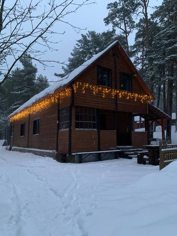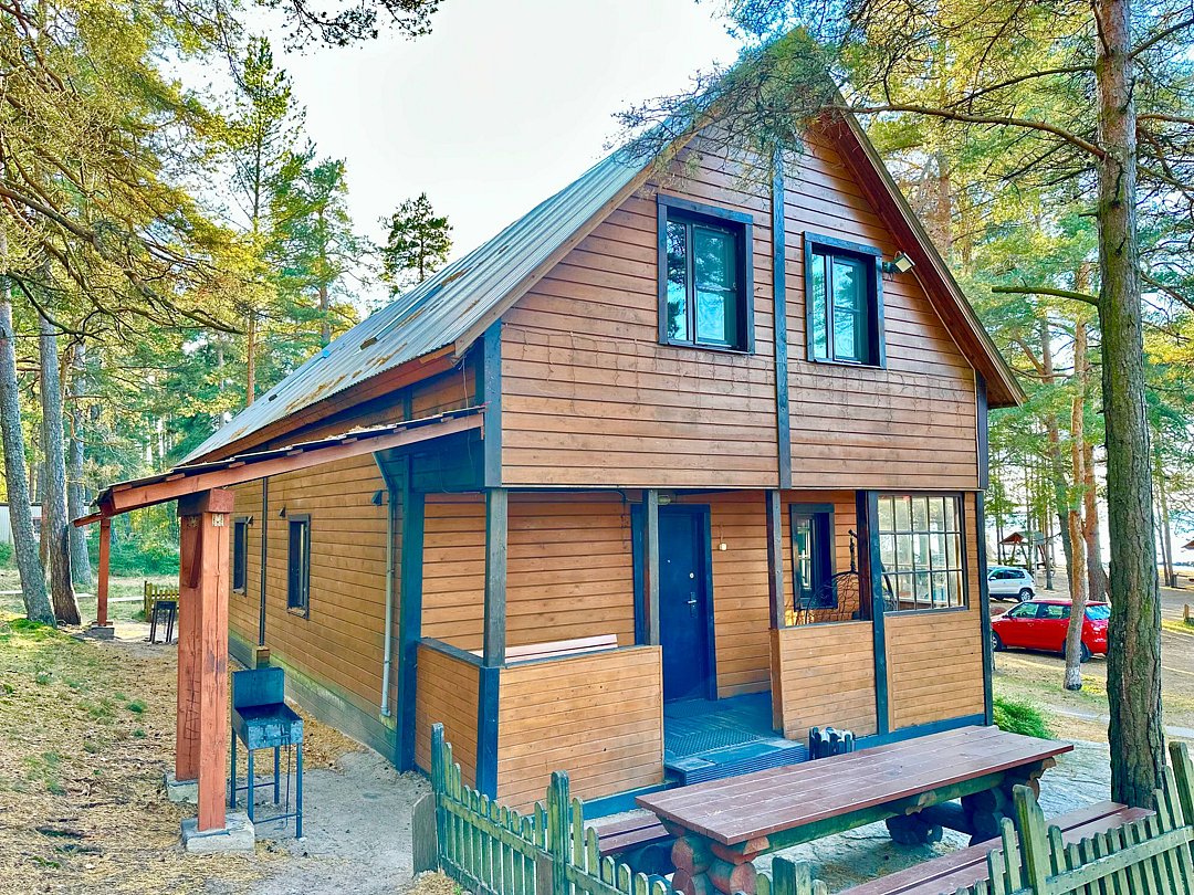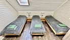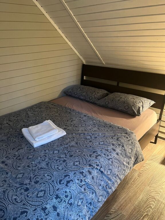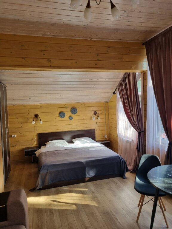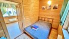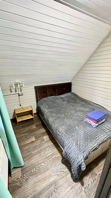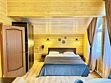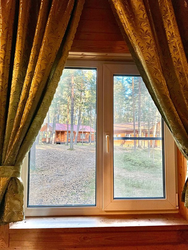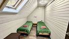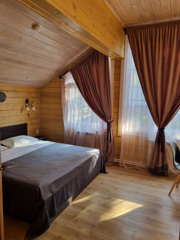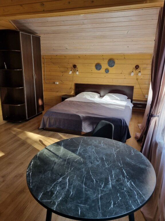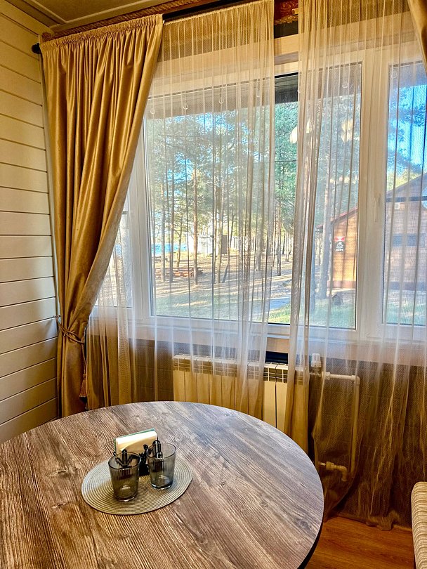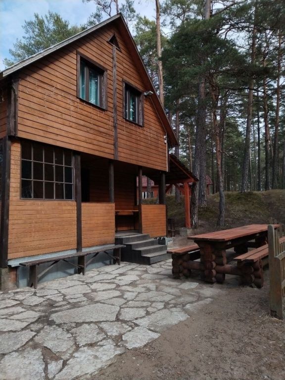 Двухэтажный деревянный коттедж-рассчитан на 10 мест (одна двухспальная и восемь односпальных кроватей). Оснащение коттеджа: постельное бельё, полотенце, санузел, холодная и горячая вода, кухня, набор посуды, СВЧ, мойка, большой обеденный стол, холодильник, чайник, TV. Рядом с коттеджем есть площадка с мангалом.