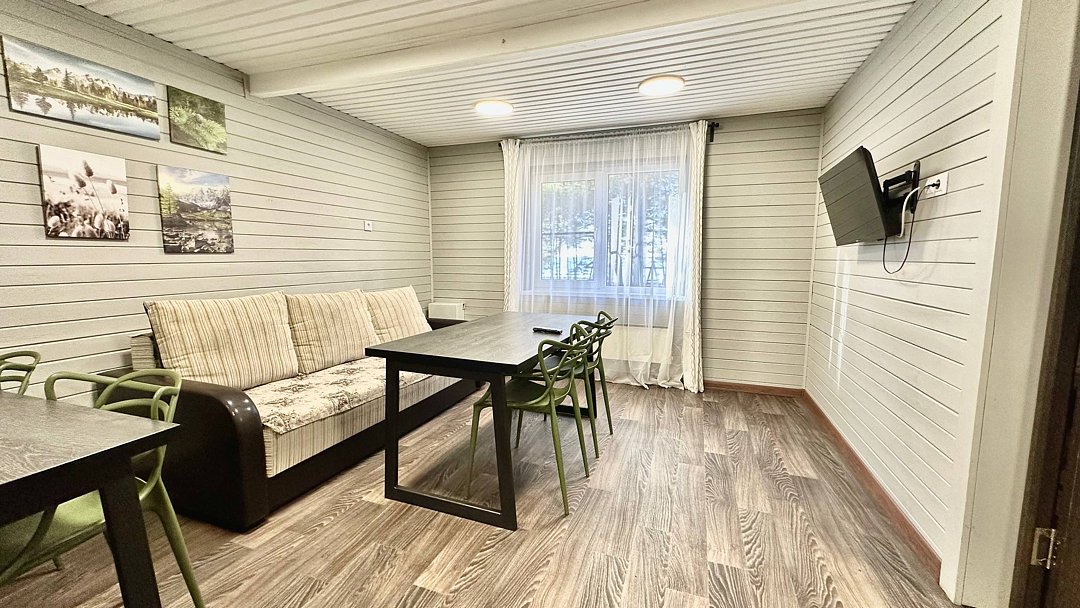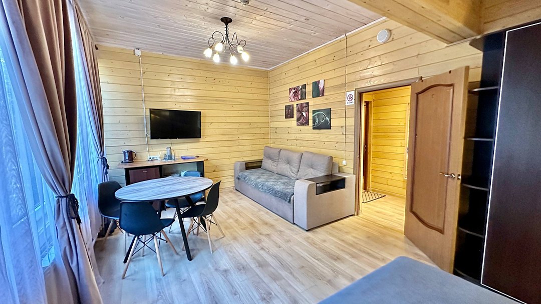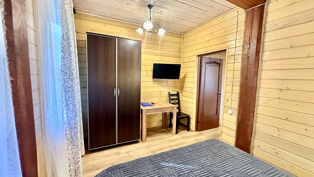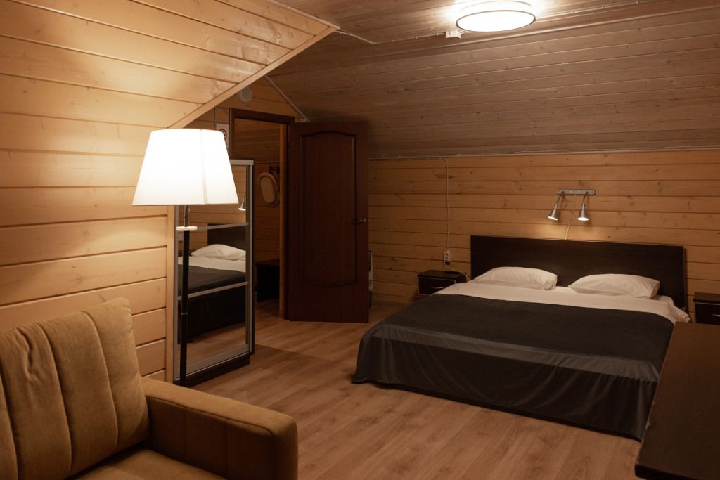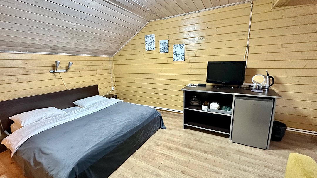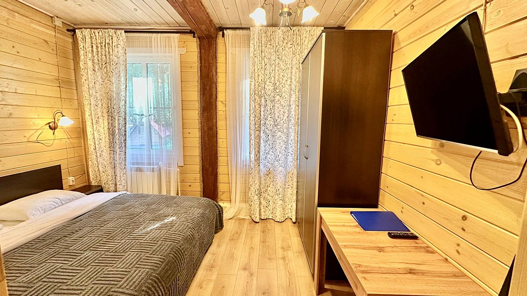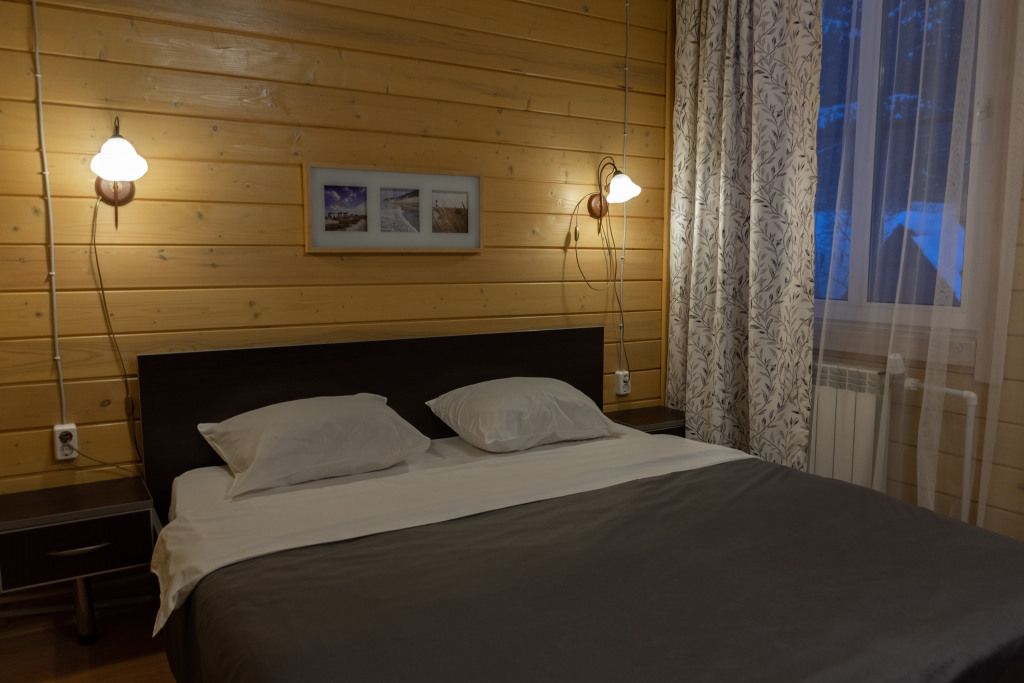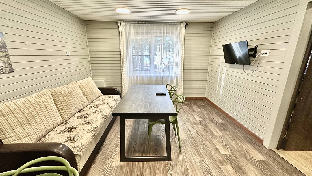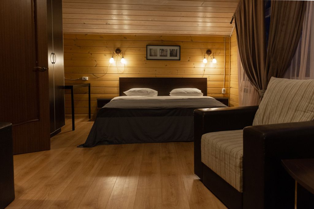 Уютный номер на двух человек (+ 2 дополнительных места). В номере есть: 2-х спальная кровать, 2-х спальный диван, ЖК телевизор, холодильник, санитарный узел, душ, горячая и холодная вода, чайник, постельное бельё, полотенца, фен.