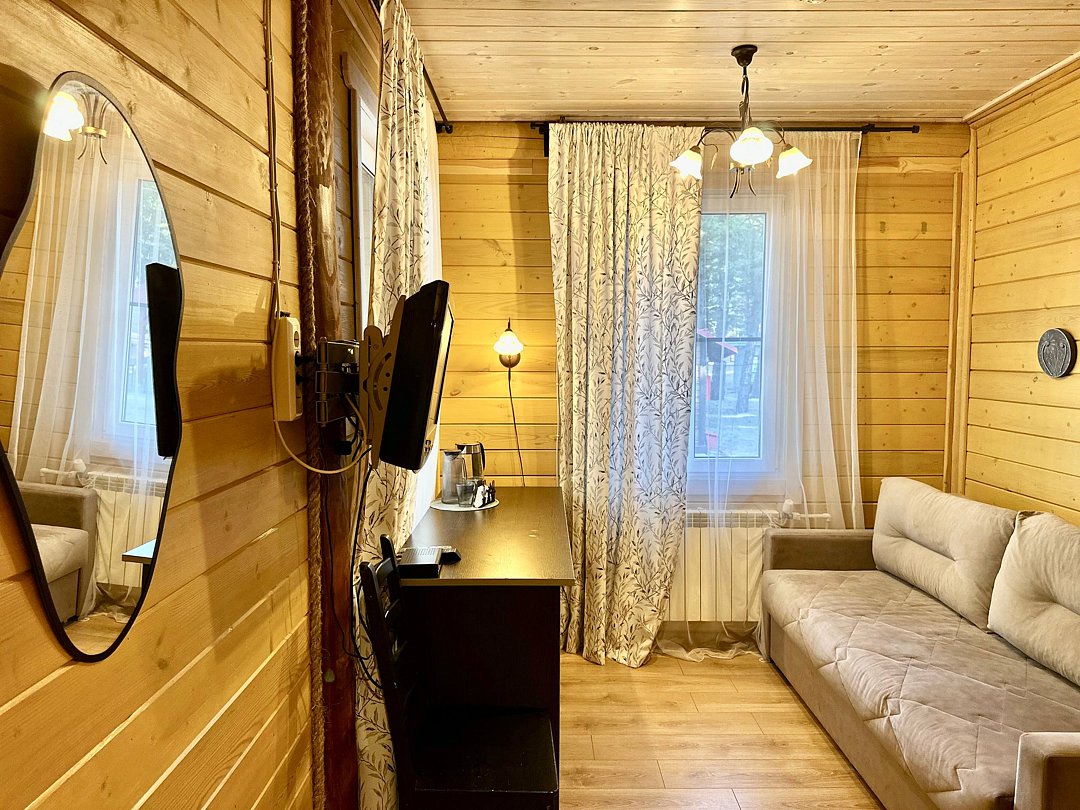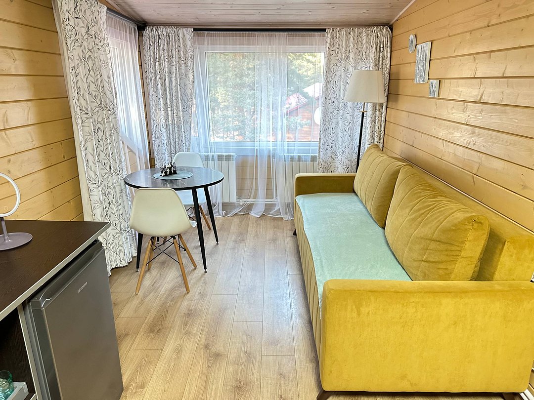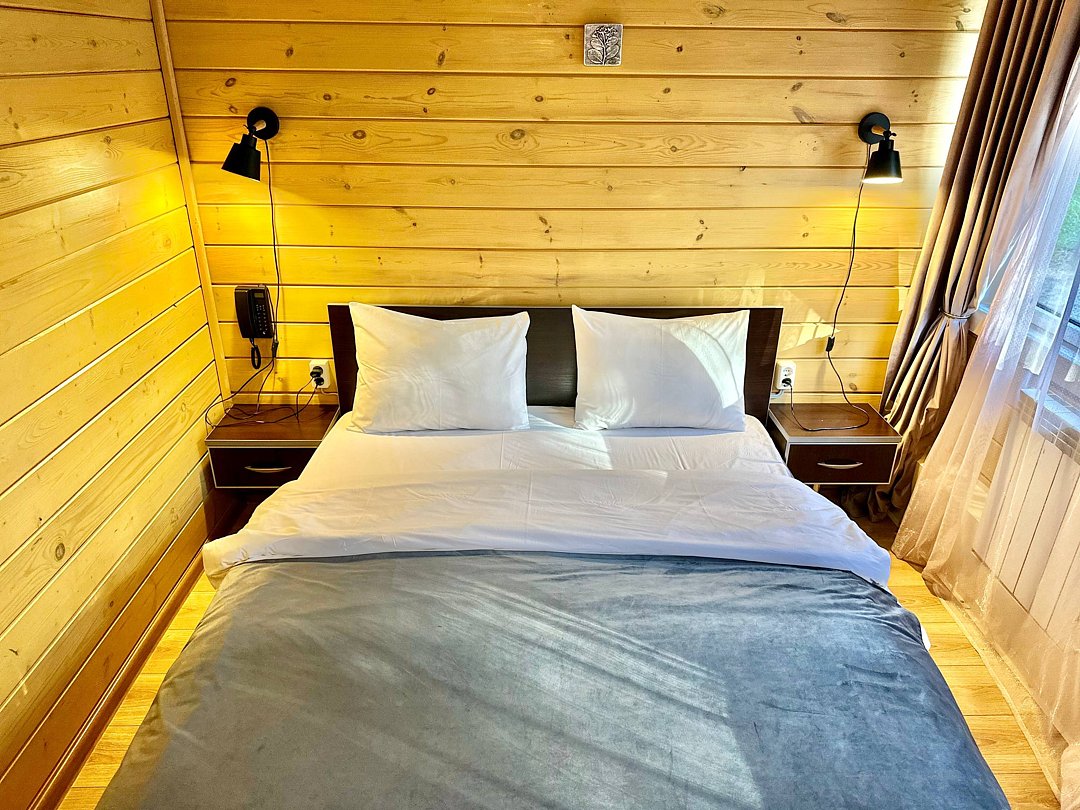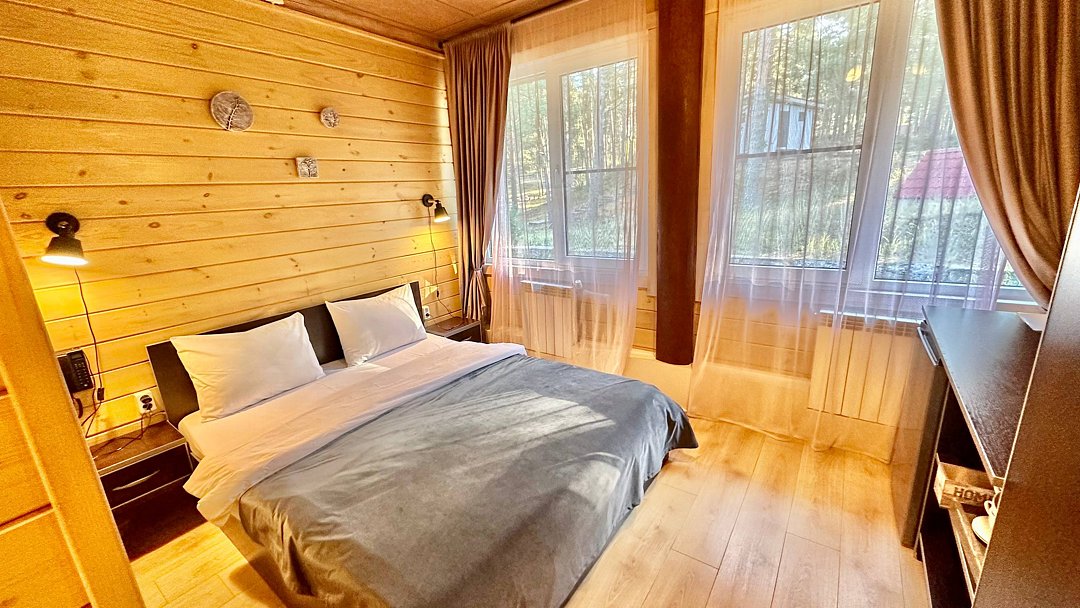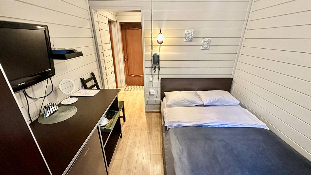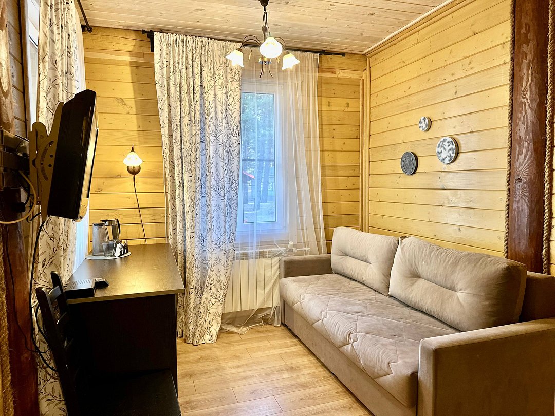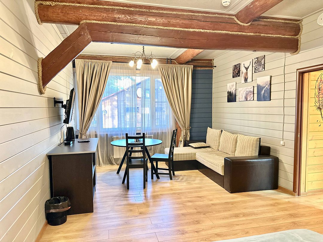 Уютный номер на двух человек (+ 2 дополнительных места). В номере есть: 2-х спальная кровать, 2-х спальный диван, ЖК телевизор, холодильник, санитарный узел, душ, горячая и холодная вода, чайник, постельное бельё, полотенца, фен.