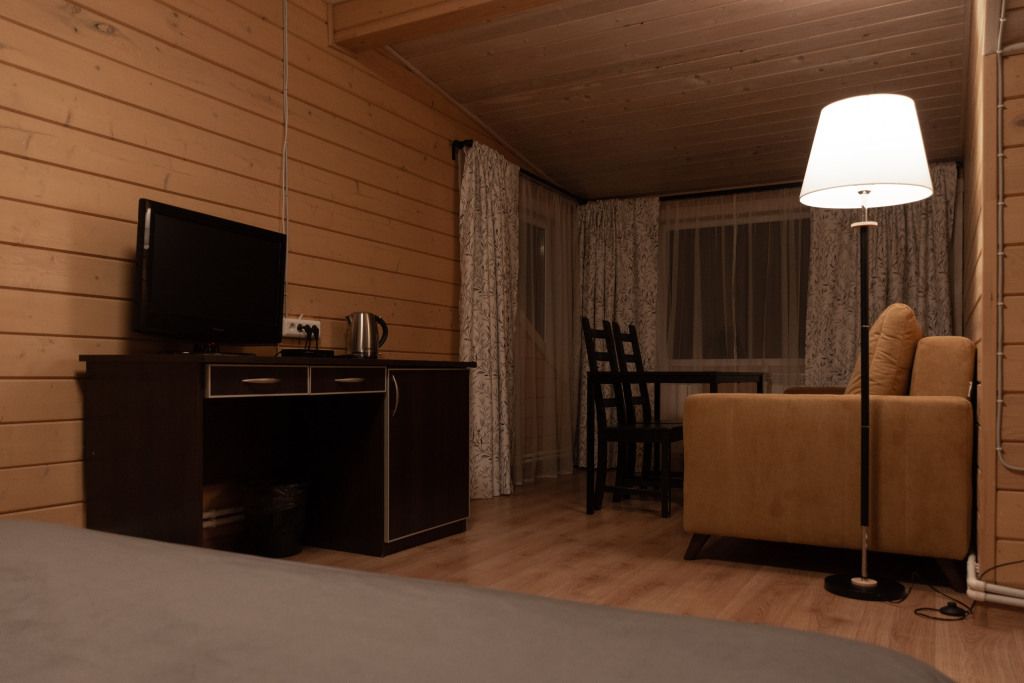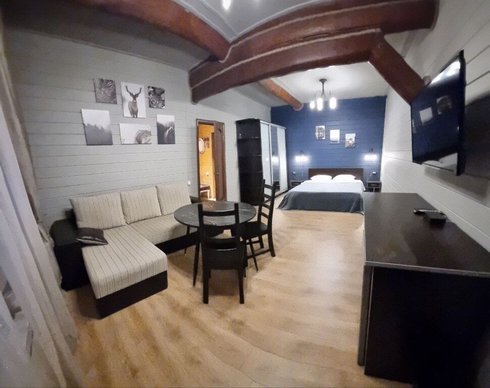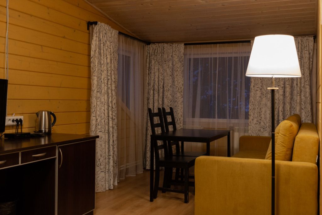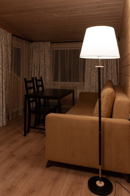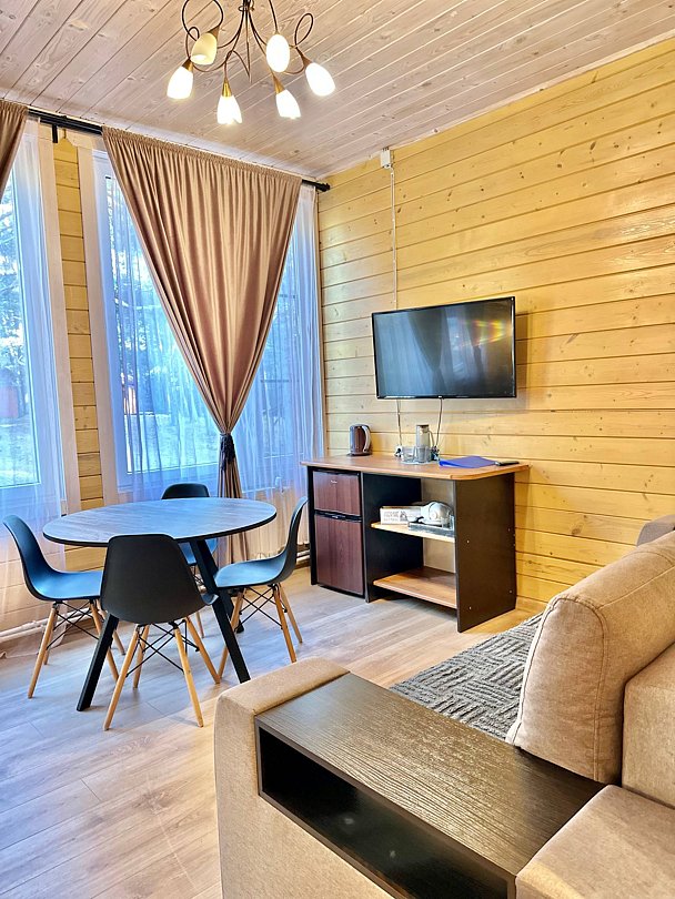 Уютный двухкомнатный номер на двух человек (+ 2 доп. места). В номере есть: 2-х спальная кровать, 2-х спальный диван, телевизор, холодильник, сан. узел, душ, горячая и холодная вода, чайник, постельное бельё, полотенца, фен.