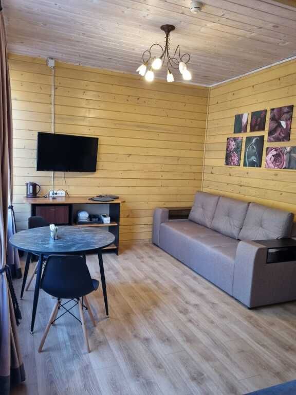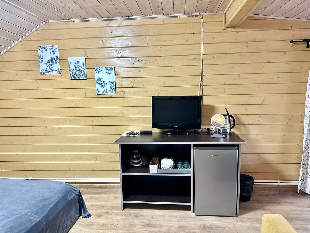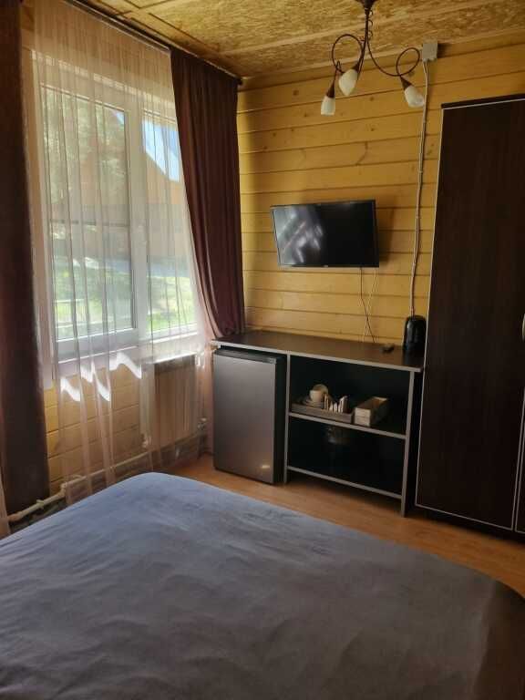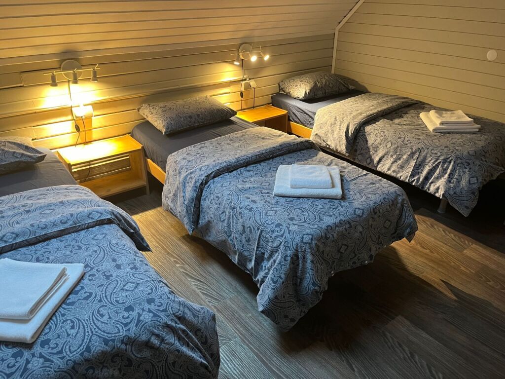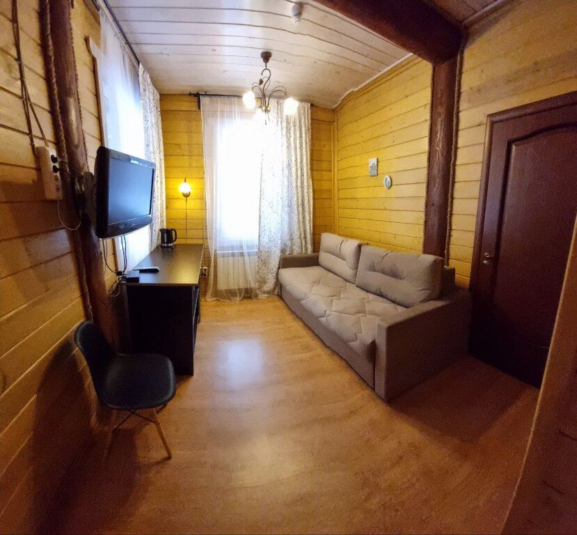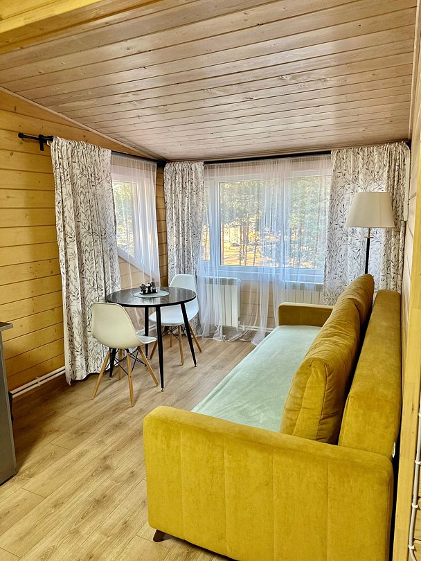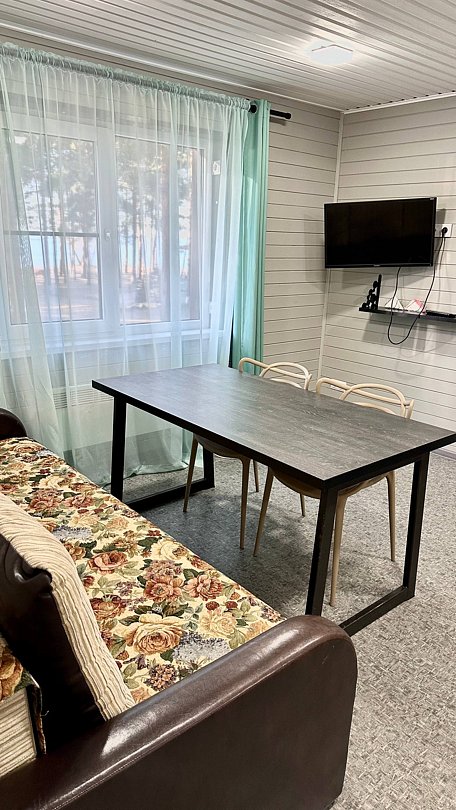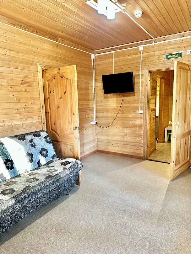 Уютный номер на двух человек (+ 2 дополнительных места). В номере есть: 2-х спальная кровать, 2-х спальный диван, телевизор, холодильник, сан. узел, душ, горячая и холодная вода, чайник, постельное бельё, полотенца, фен.