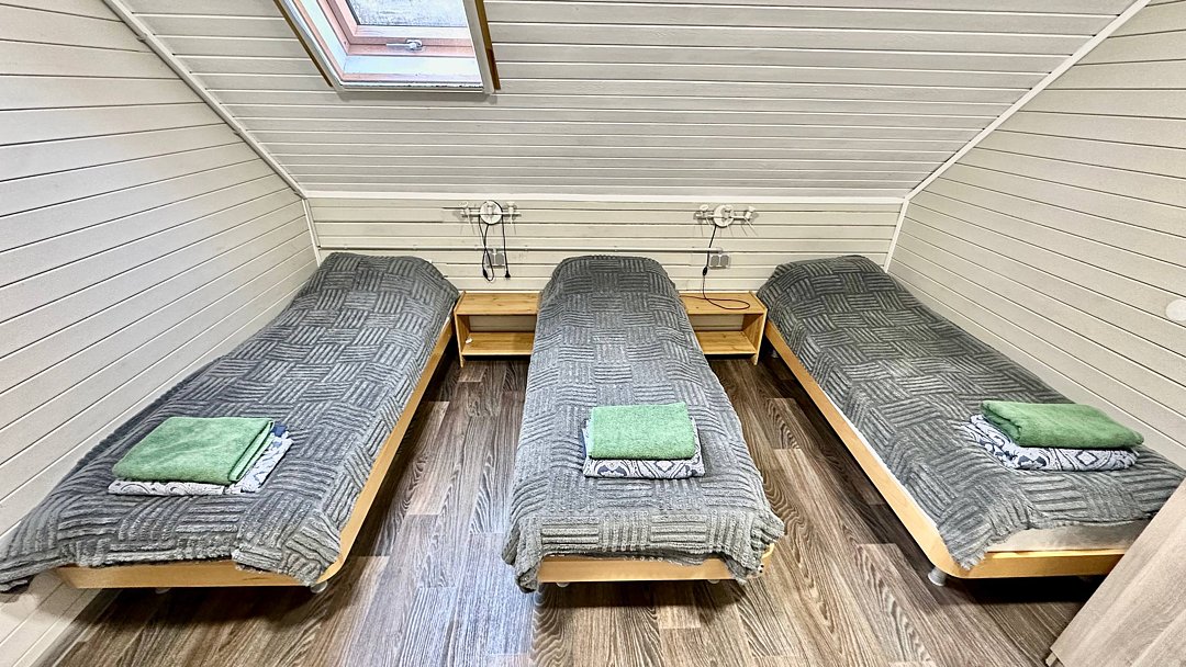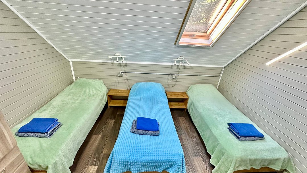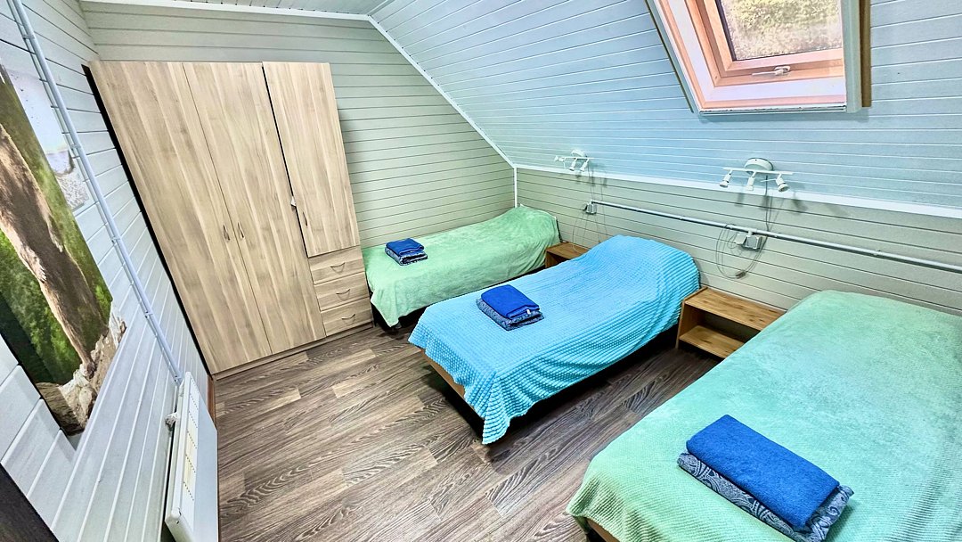 3 комнаты: в двух комнатах располагается двухспальная и двухъярусная односпальная кровати. Проходная комната с двухспальной кроватью.