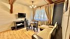 Первый этаж коттеджа предназначен для проведения застолий и отдыха. Здесь располагается кухня, санузел и столовая с большим общим столом. На кухне есть все необходимое-микроволновая печь, чайник, холодильник и столовые приборы. В зоне отдыха можно посмотреть фильмы или музыкальные каналы.