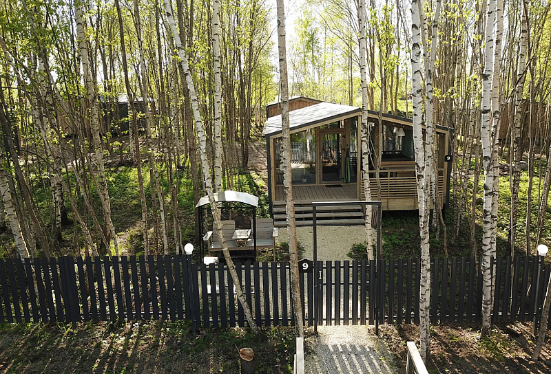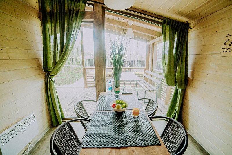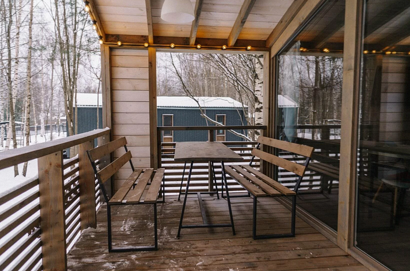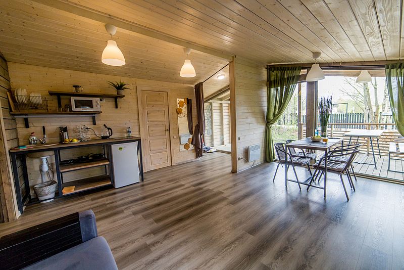 Кухонная зона оборудована плитой, чайником, холодильником, микроволновой печью. В коттедже - конвекторы. Ванная комната с душем и раковиной. На просторной террасе приятно отдыхать и наблюдать за красотами природы.