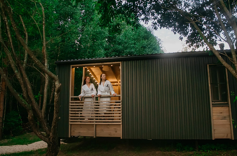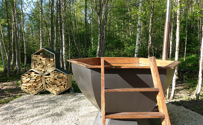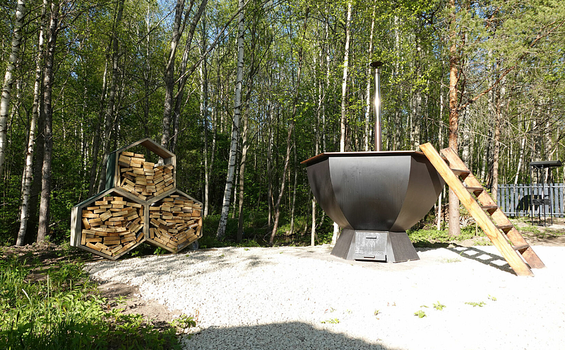Горячие ванны на открытом воздухе. Печь дает возможность нагреть воду до определенной температуры, благодаря этому купание в чане комфортно даже в зимнее время года. Выполнен из натурального дерева с удобными сидениями и подставками для ног.
