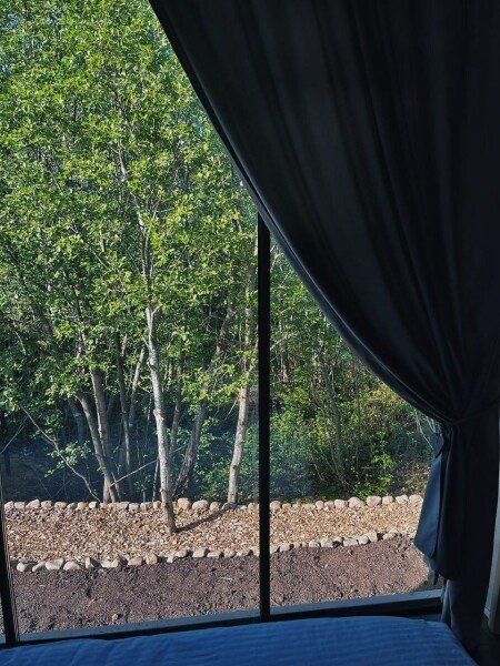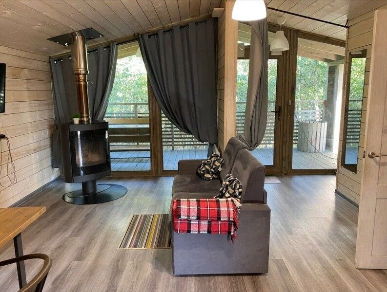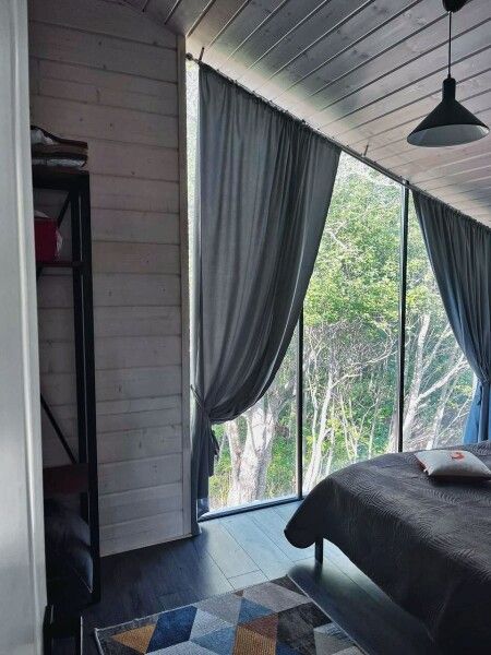Коттедж имеет 1 изолированную спальную комнату с панорамным остеклением. В спальне двуспальная кровать, стеллаж для одежды, ночная лампа, шторы блэкаут и телевизор.