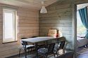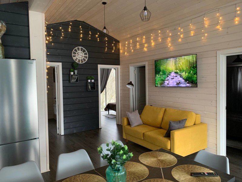 В гостиной зоне расположен раскладной диван, обеденный стол и стулья, камин, плазменный телевизор. Коттедж отапливается настенными конвекторами установленными в каждой зоне дома.