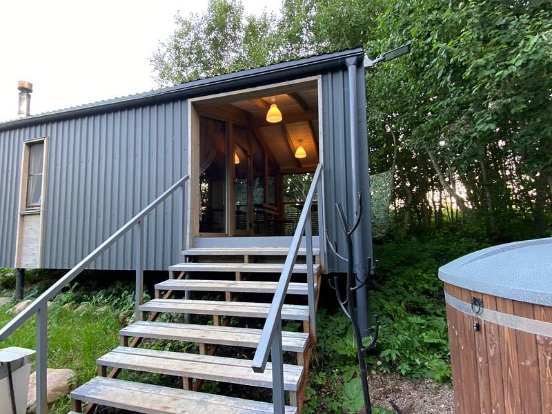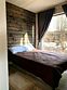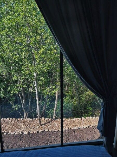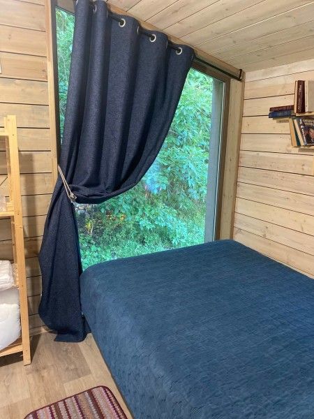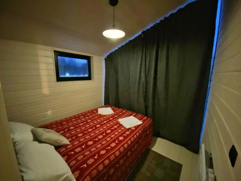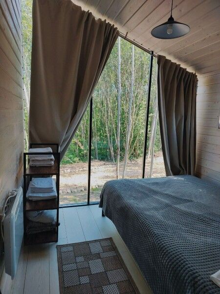 Коттедж имеет 1 изолированную спальную комнату с панорамным остеклением. В спальне двуспальная кровать, стеллаж для одежды, ночная лампа, шторы блэкаут.
