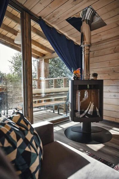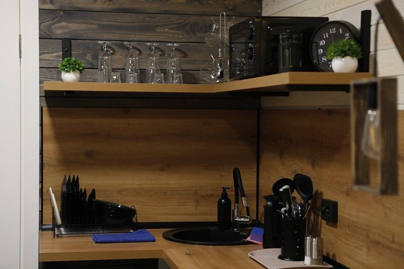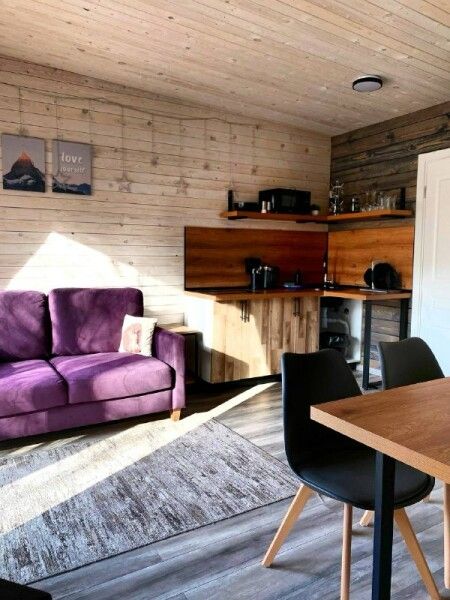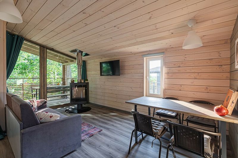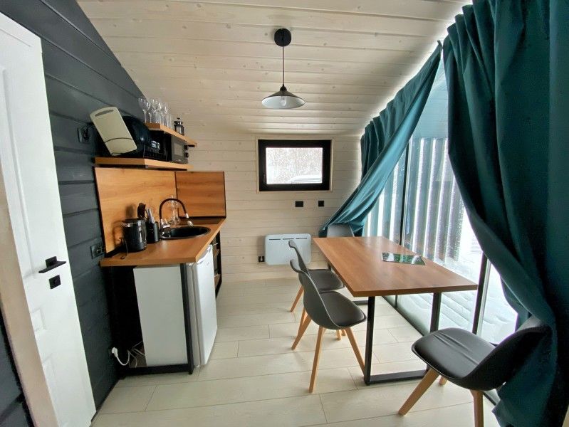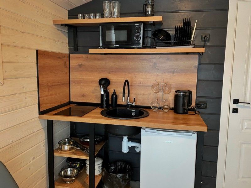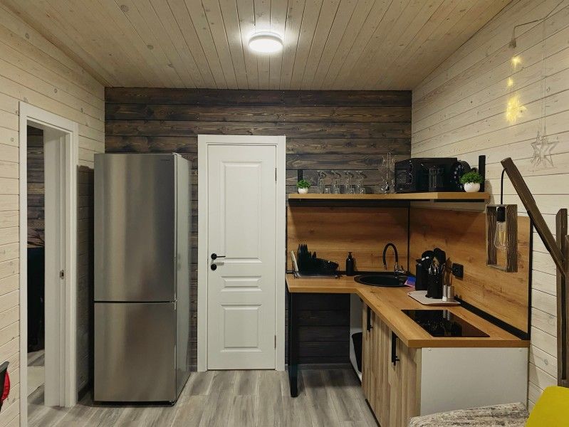 Просторная студия 20 кв.м с панорамным видом на террасу и удобным кухонным модулем включающий в себя: варочную панель, микроволновую печь, чайник, холодильник на 93л, раковину и посуду для приема и приготовления пищи на 2 гостя. В гостиной зоне расположен обеденный стол и стулья, камин, плазменный телевизор.