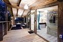 Терраса с панорамным видом на лес и зону барбекю, площадью 10 кв.м оборудована деревянным столом и скамейками со спинкой, розетками и освещением по периметру и зонам.