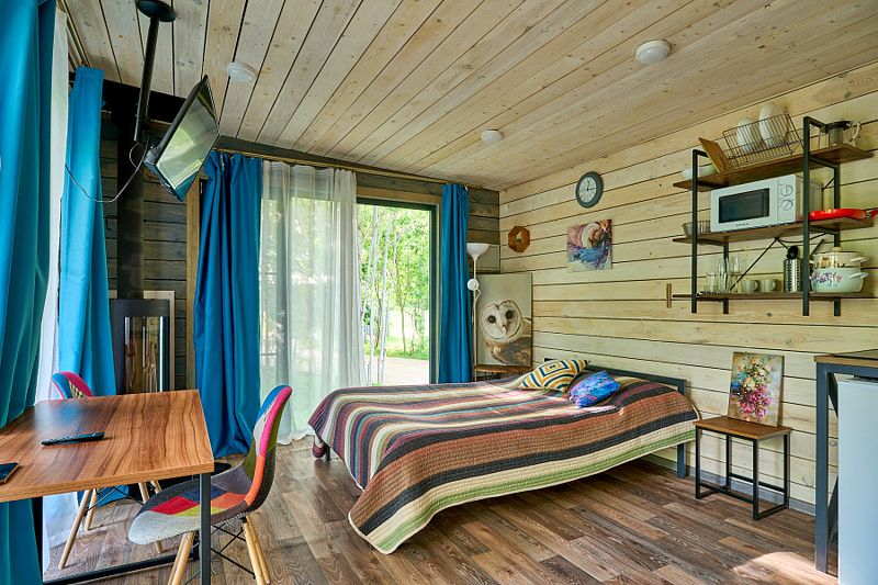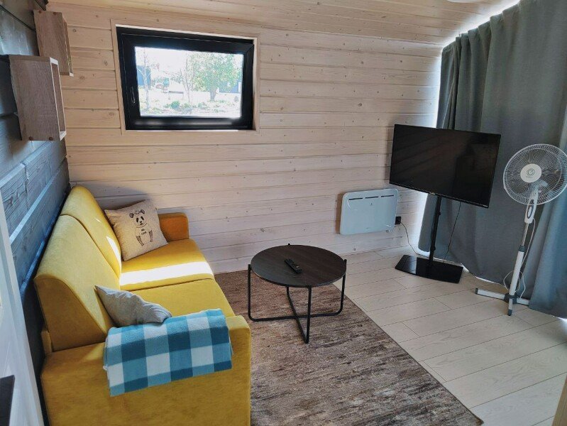 Дом имеет 2 изолированные спальни с панорамными окнами площадью по 9 кв.м. В каждой спальне двуспальная кровать, стеллаж под одежду, прикроватная лампа и шторы блэкаут.