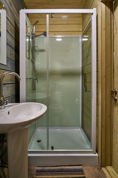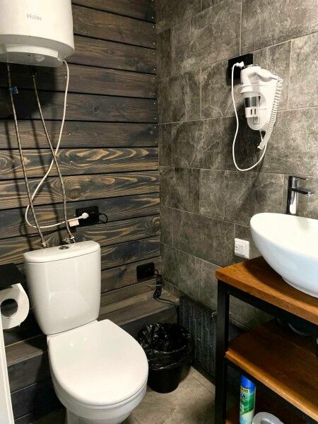 Небольшой санузел в котором уместилось все необходимое: Ванная/душевая кабина, унитаз, раковина на пьедестале с зеркалом, фен, гигиенические принадлежности и средства, 2 полотенца на каждого гостя.