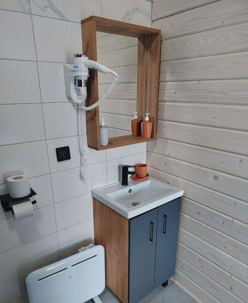 Небольшой санузел в котором уместилось все необходимое: Ванная/душевая кабина, унитаз, раковина на тумбе с зеркалом, фен, гигиенические принадлежности и средства, по 2 полотенца на каждого гостя.