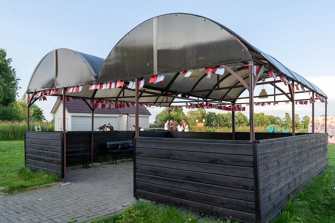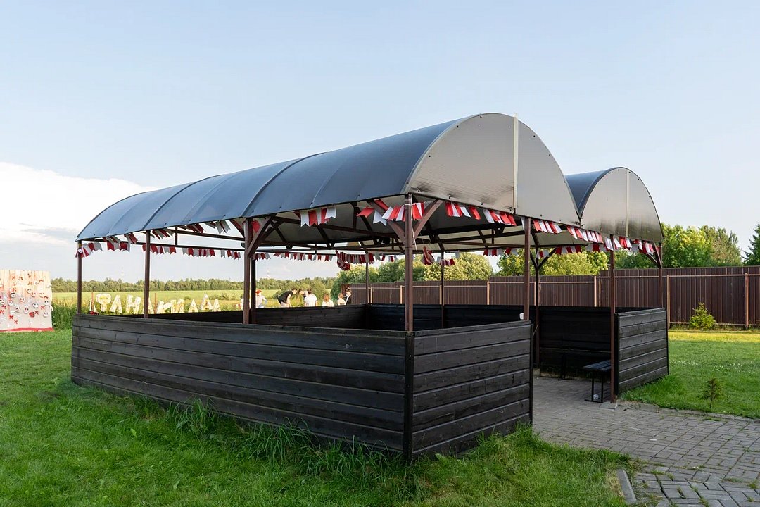 Мангальная зона у коттеджа Мюреля 12. Навес, большой мангал, много шампуров, Решетка — 3 шт. Уголь (2,5 кг) — 2 шт.