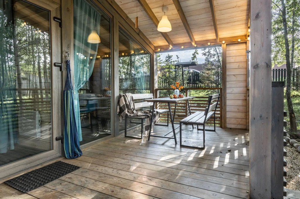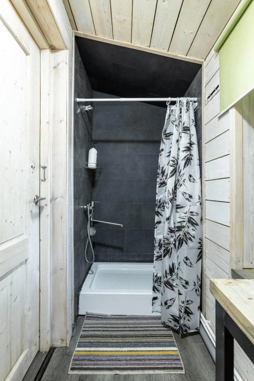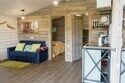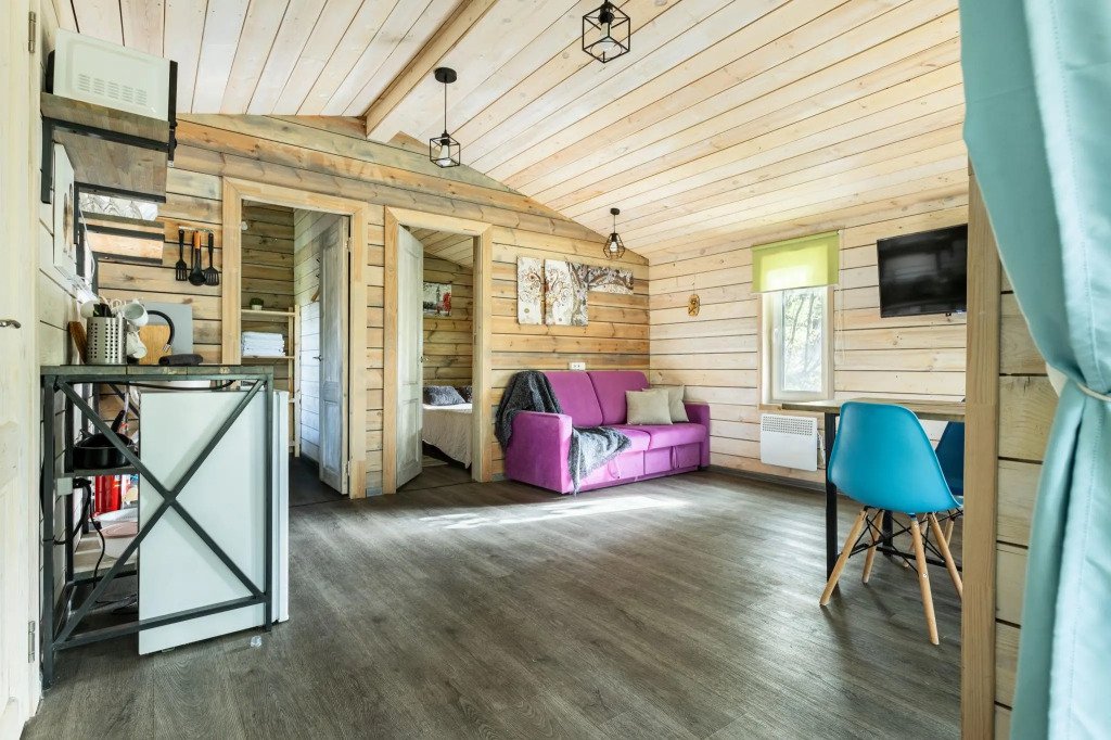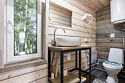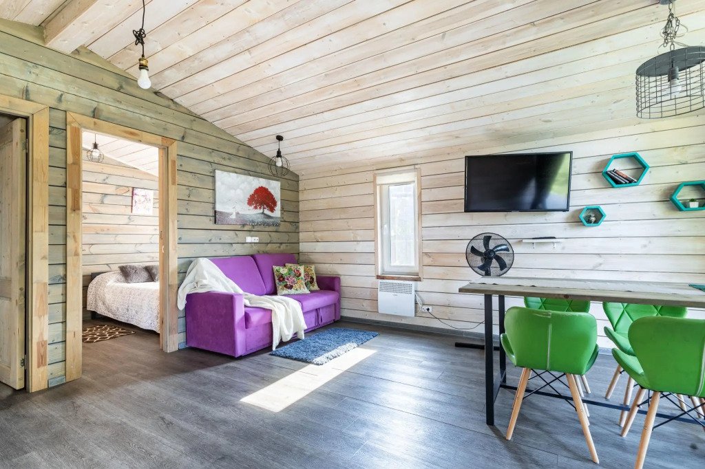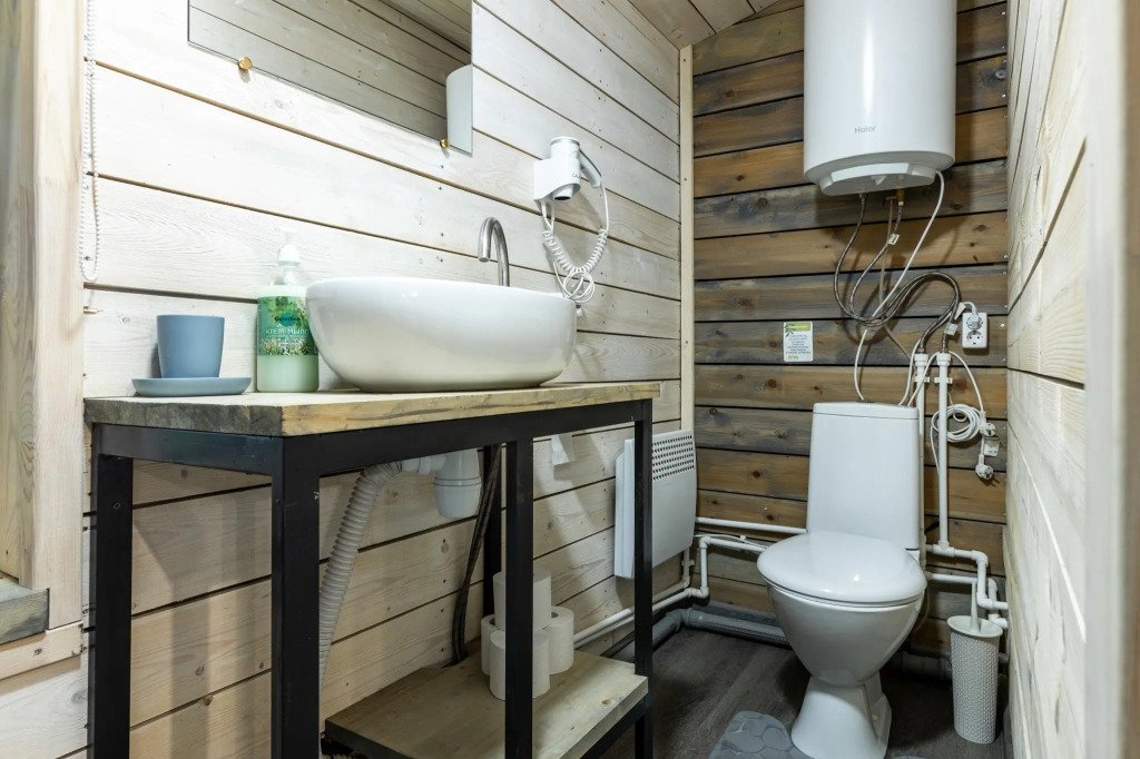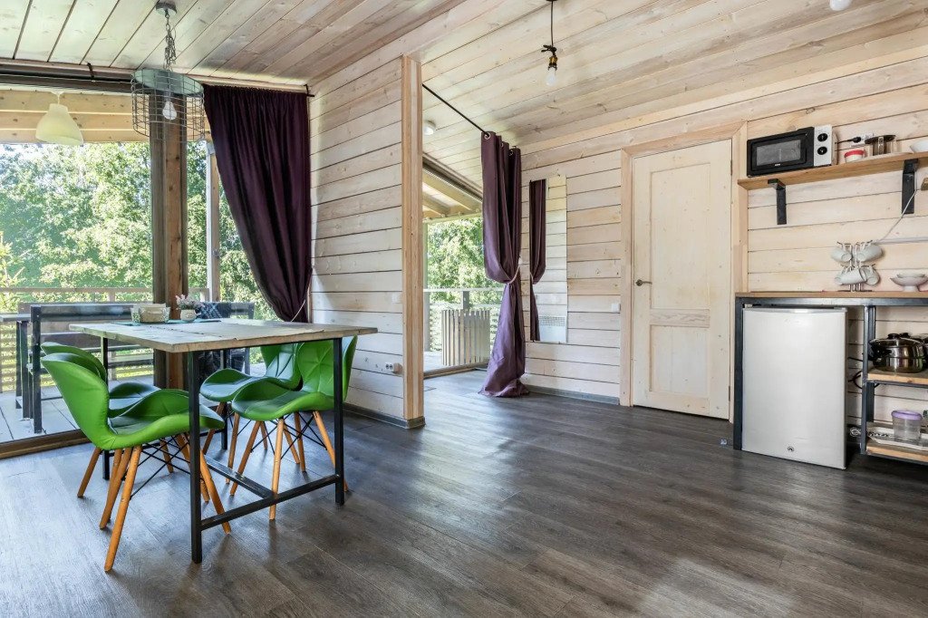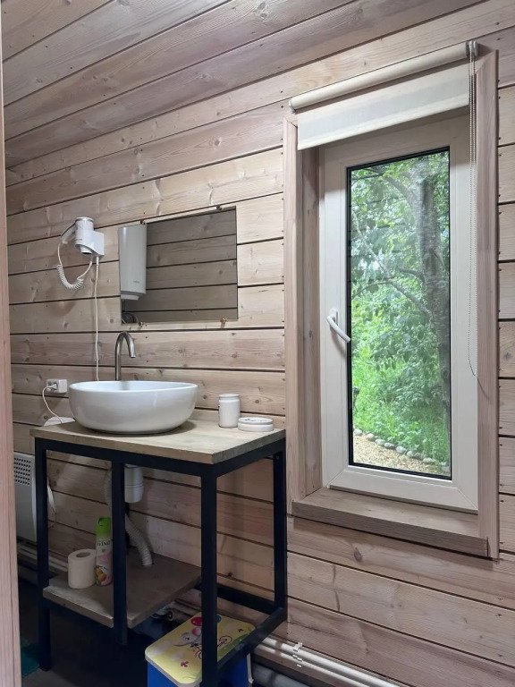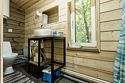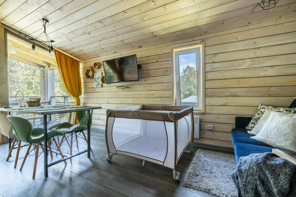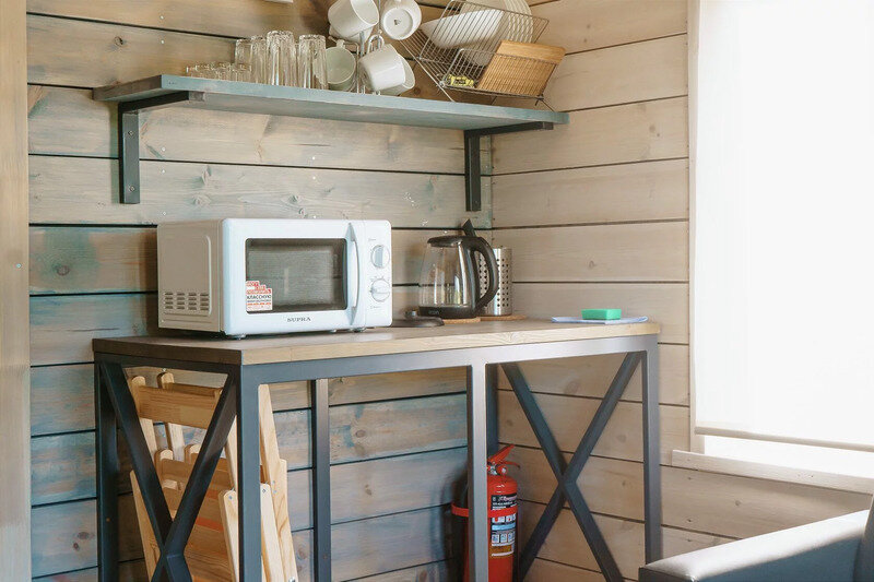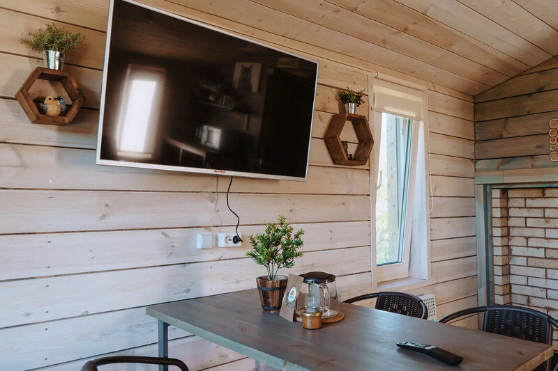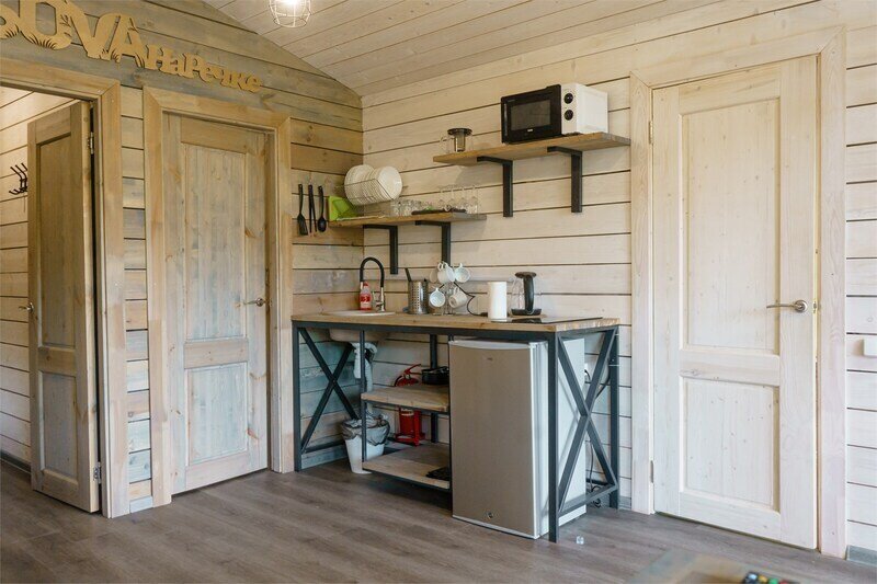 В банном доме есть кухонная зона с кулером, микроволновой печью, чайником и посудой, гостиная зона с панорамными окнами, столом, диваном и телевизором. Совмещенный санузел. Крытая терраса с уличной мебелью.