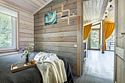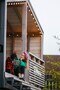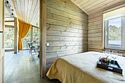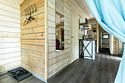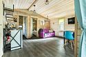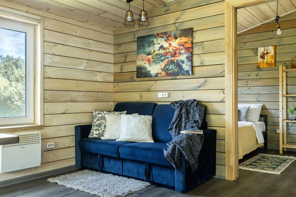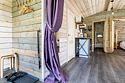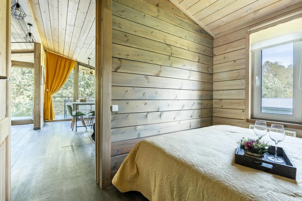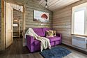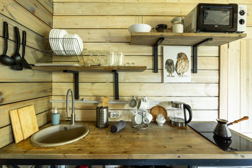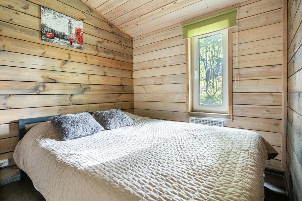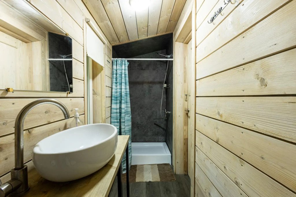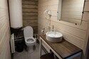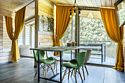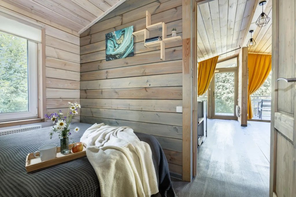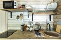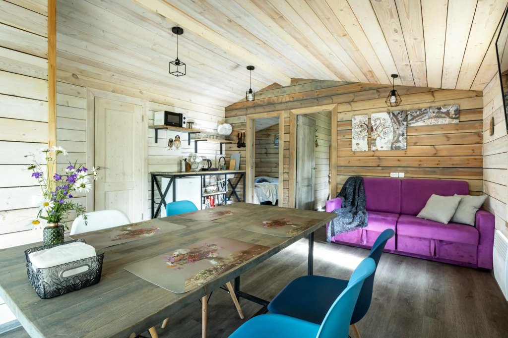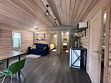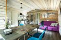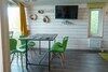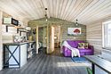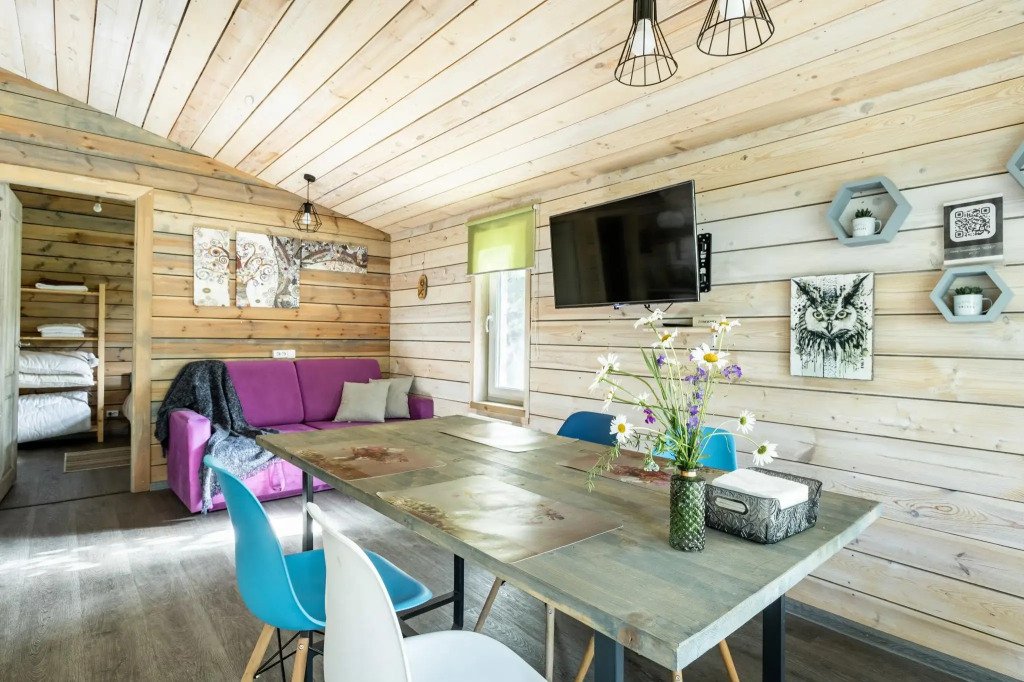 В банном доме есть кухонная зона с кулером, микроволновой печью, чайником и посудой, гостиная зона с панорамными окнами, столом, диваном и телевизором. Совмещенный санузел. Крытая терраса с уличной мебелью.