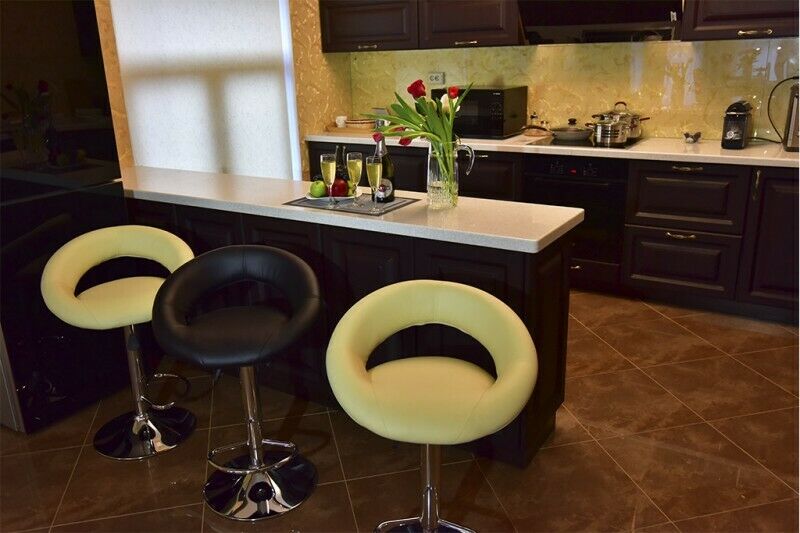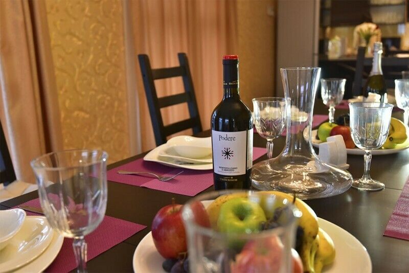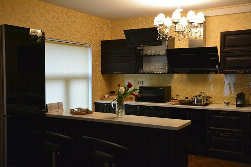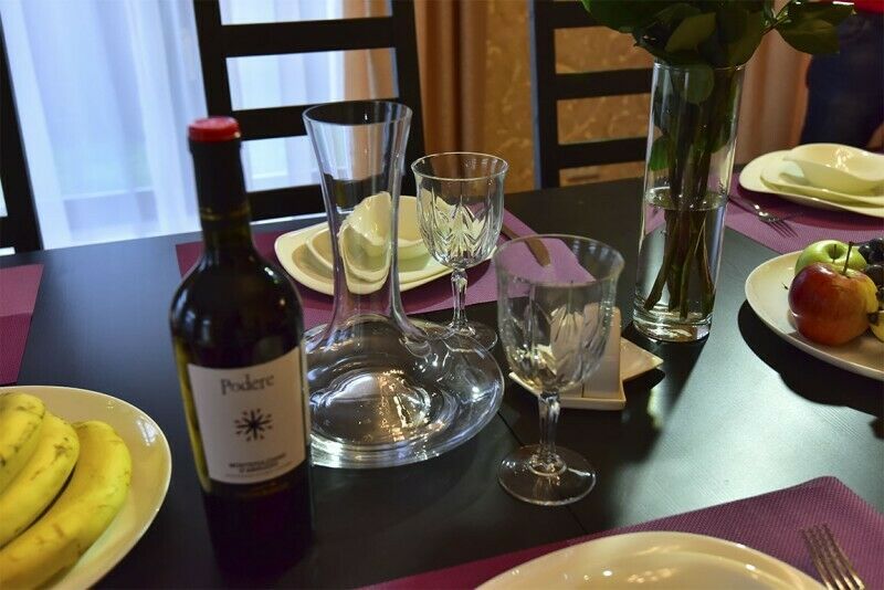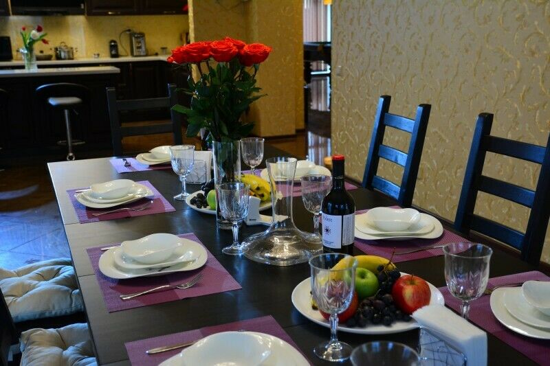 На кухне: холодильник, кофемашина, термопот, духовка, посудомоечная машина, посуда и столовые принадлежности на 12 человек, включая фужеры, бокалы, рюмки.