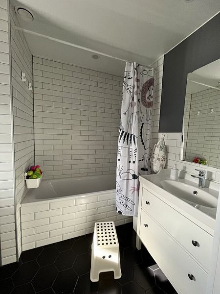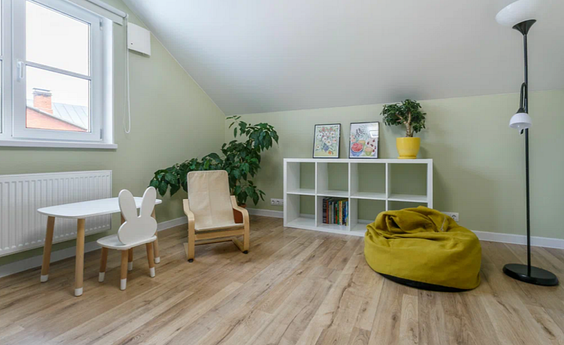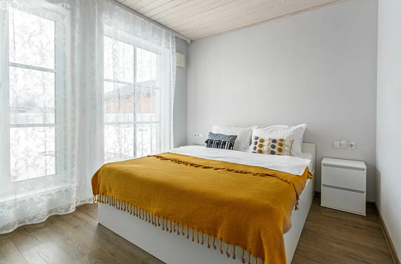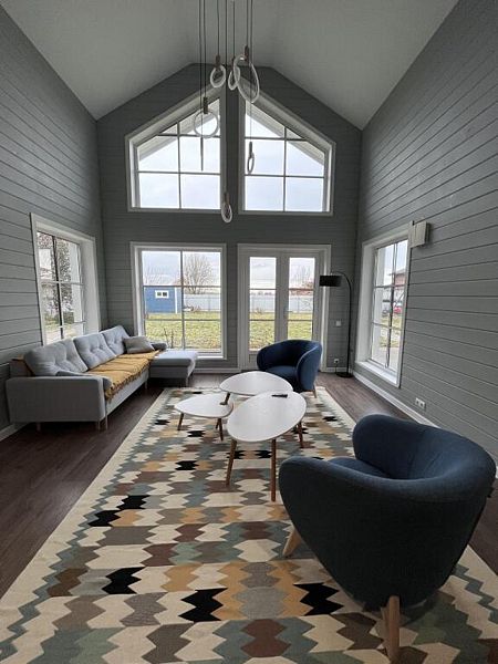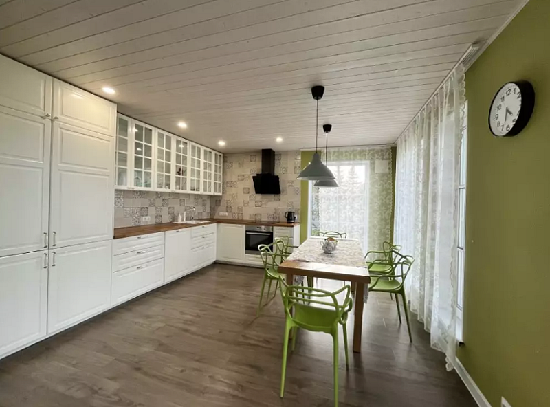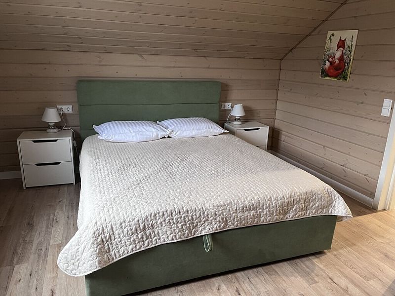 В доме гостиная-кухня с панорамными окнами в сад, раскладным диваном. Четыре изолированные спальни: 2 - с двуспальными кроватями и ортопедическими матрасами Аskоnа, 2 - с раскладными двухместными диванами, 3 санузла (один - с ванной, в двух - раковина и унитаз), отдельно стоящая русская баня, зона барбекю, парковка, детская площадка, теплица, грядки с фруктами-овощами-зеленью в летний сезон. Все удобства для комфортного проживания.