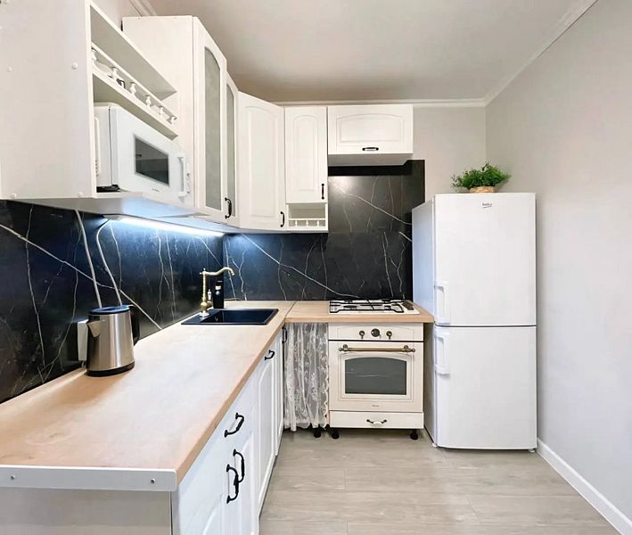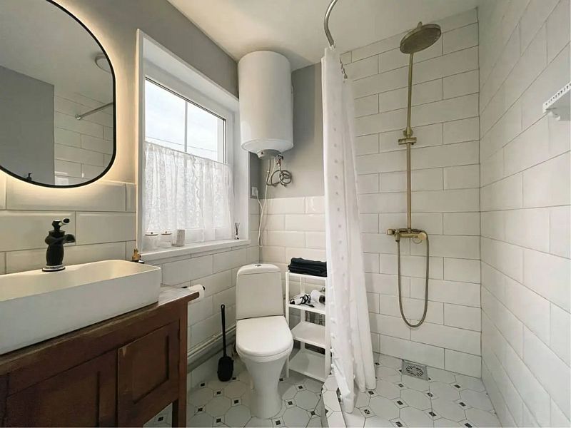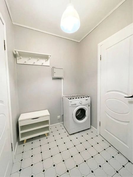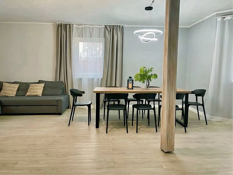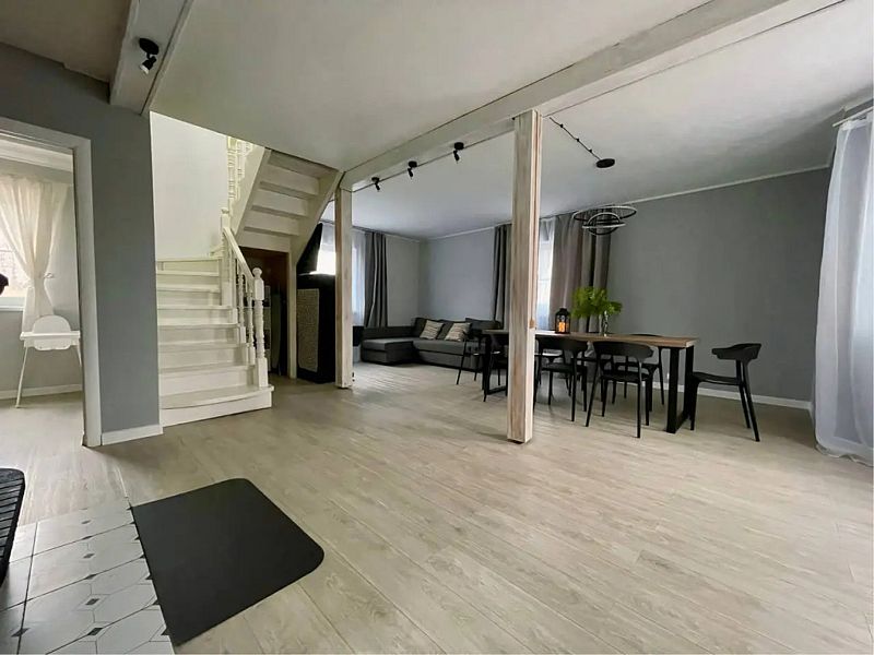 На первом этаже расположена гостиная с обеденной зоной, раскладным двуспальным диваном, санузел с душевой кабиной, фен, стиральная машина, Wi-Fi, работает smart TV. Отдельная кухня с посудой для приготовления и сервировки блюд, холодильником, плитой, духовым шкафом, микроволновой печью, электрическим чайником. Для маленьких детей есть стульчик для кормления, книжки и настольные игры.
