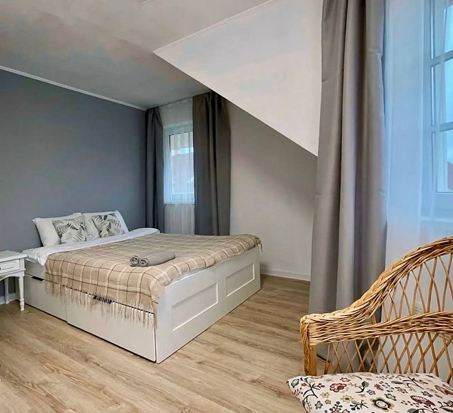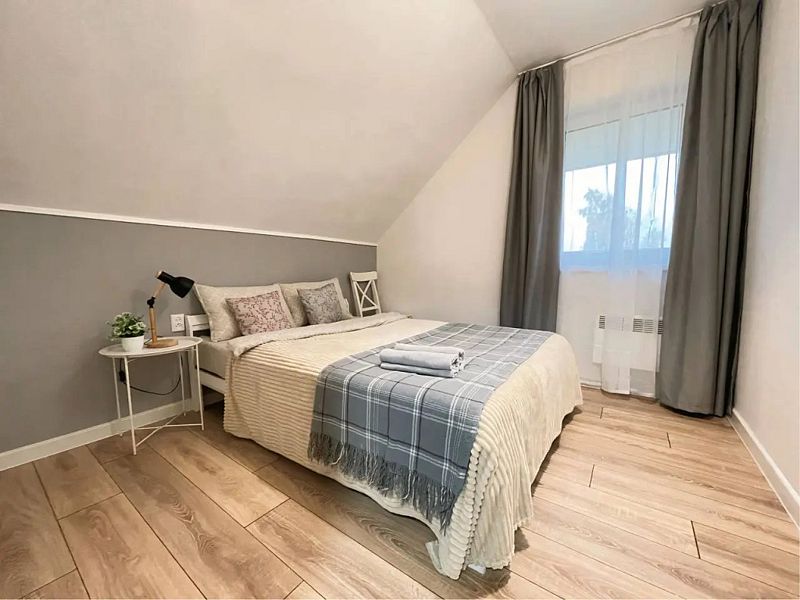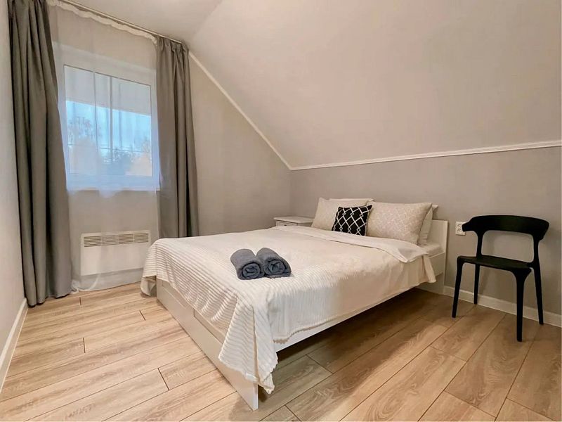 На втором этаже: 3 комнаты с двуспальными кроватями и детской кроваткой. Постельное бельё, полотенца, гигиенические принадлежности входят в стоимость аренды.