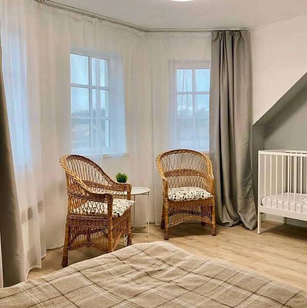 На втором этаже: 3 комнаты с двумя односпальными кроватями, двумя двуспальными кроватями и детской кроваткой. Постельное бельё, полотенца, гигиенические принадлежности входят в стоимость аренды.