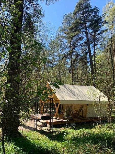 Большой шатер-палатка с собственной террасой. В нём удобно устроится до 2-х человек. Глэмпинг создан для уютных вечеров на природе и утреннего кофе под пение птиц.