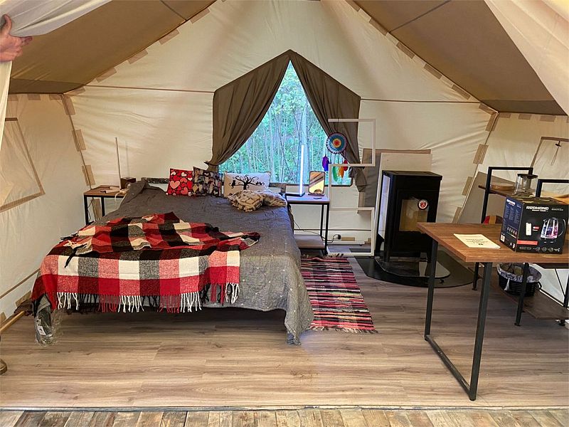 Глэмпинг — палатка на локациях На заливе включает в себя: проживание, парковку, санузел в отдельном помещении (на расстоянии 50 метров), постельное белье в инвидуальной упаковке, простынь с подогревом, москитная сетка, печка и топливные брикеты.