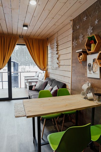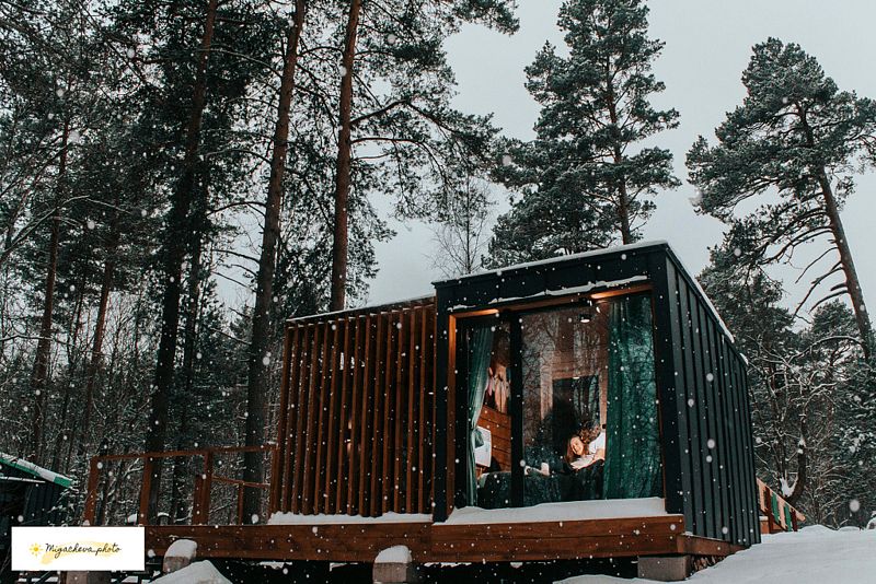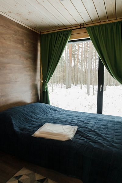 В банном доме есть кухонная зона с кулером, микроволновой печью, чайником и посудой, гостиная зона с панорамными окнами, столом, диваном и телевизором. Совмещенный санузел. Крытая терраса с уличной мебелью.Баня работает с 12:00 до 01:00.