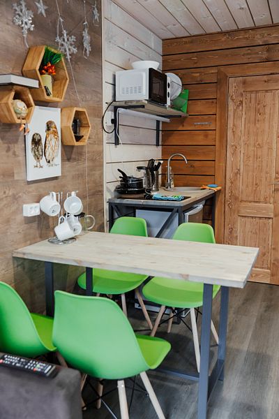 Кухонная зона со всем необходимым. В номере - конвекторы. Ванная комната. Спальня с двуспальной кроватью. На территории бесплатный Wi-Fi.