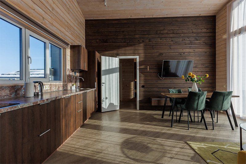Уютная гостиная с диваном и телевизором, мини-кухня с плитой и столовой посудой, две спальни с панорамными окнами, собственная терраса с мебелью созданы для Вашего комфортного пребывания.