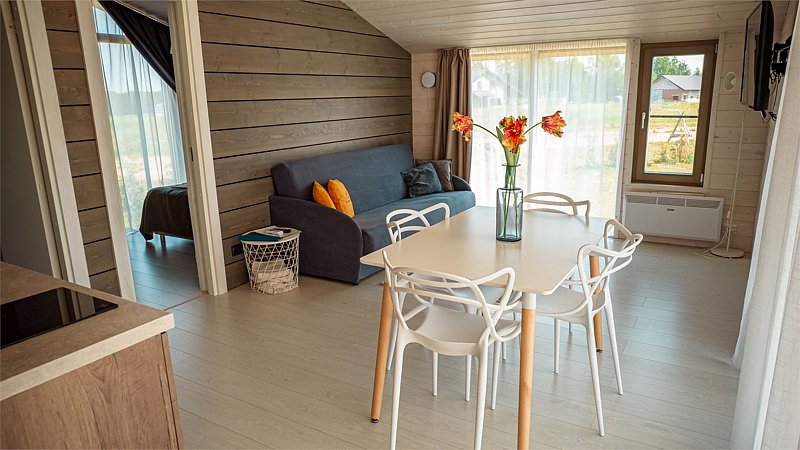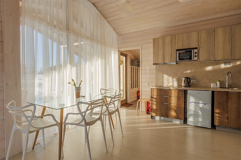 Просторная прихожая, санузел, уютная гостиная с диваном и телевизором, кухня с плитой, две спальни с панорамными окнами, собственная терраса с мебелью созданы для Вашего комфортного пребывания. В непосредственной близости от коттеджа расположена гриль-беседка с мангалом и мебелью.