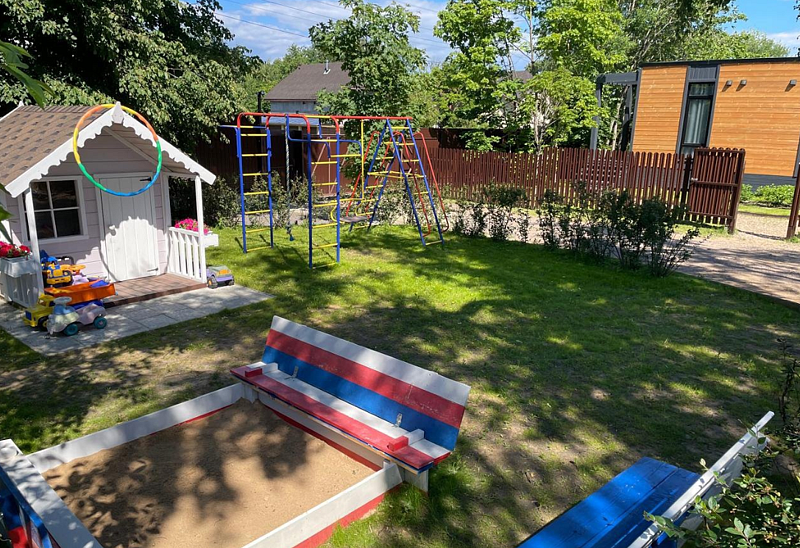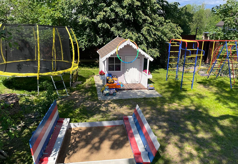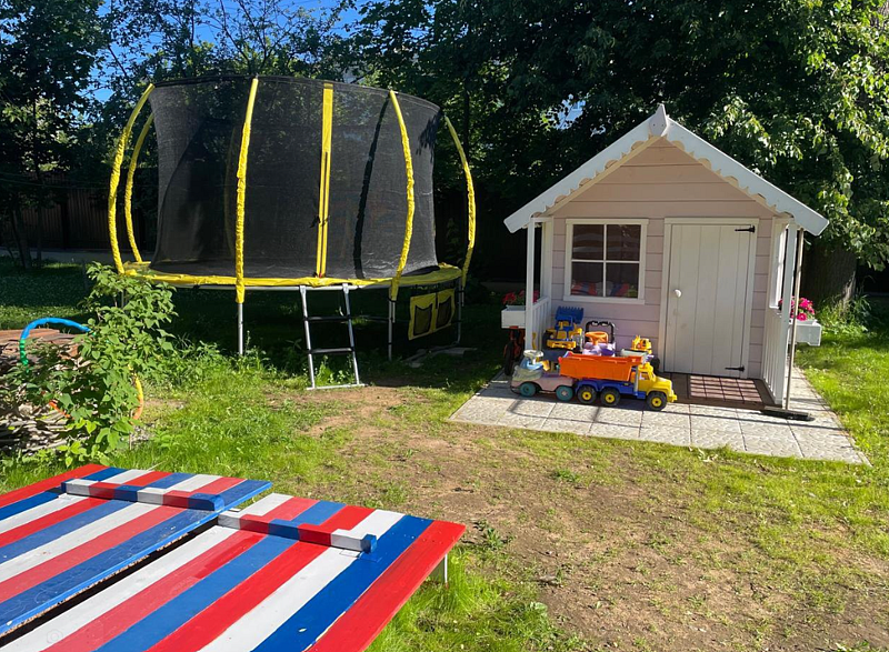 Есть всё необходимое для самых маленьких гостей (песочница, домик с игрушками, качель с лазилками) а для детей постарше батут.