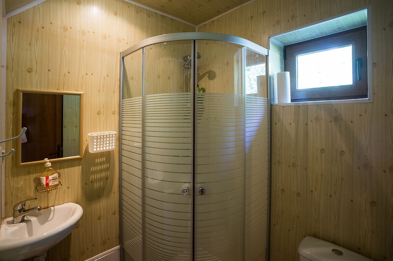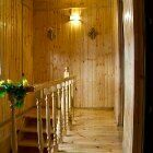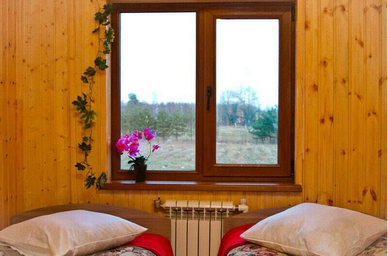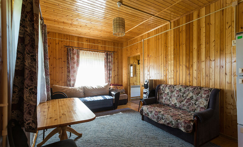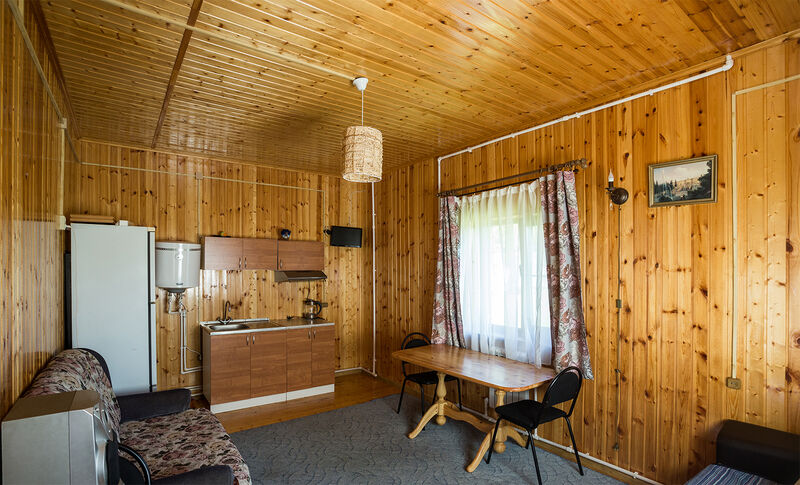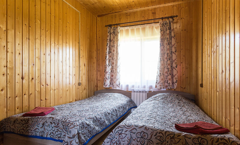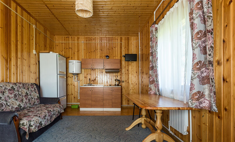 Дома возведены из бруса. Их убранство отвечает требованиям сегодняшнего времени. На первом этаже есть гостиная, туалет, душ, кухня оборудованная современной бытовой техникой, на втором комнаты для сна отдыха. В коттеджах может проживать четыре гостя одновременно. Если же гости будет желание, то они могут воспользоваться еще двумя кроватями, установленными в гостиной комнате. В каждом строении есть спутниковое телевидение, холодильная камера, плита, посуда, столовые приборы. Всем предоставляется постельное белье, теплые покрывала, банные принадлежности.