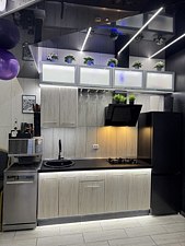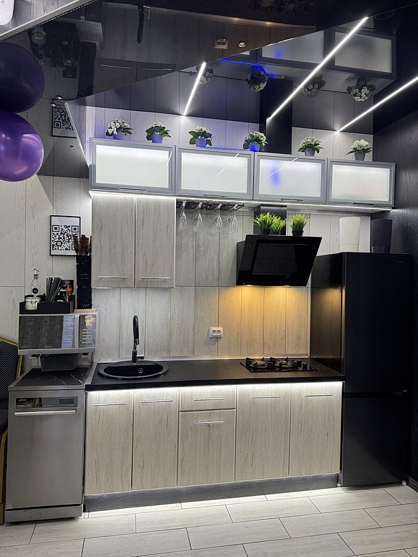 Гостиная оборудована зоной отдыха и встроенной кухней с современной бытовой техникой.
