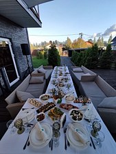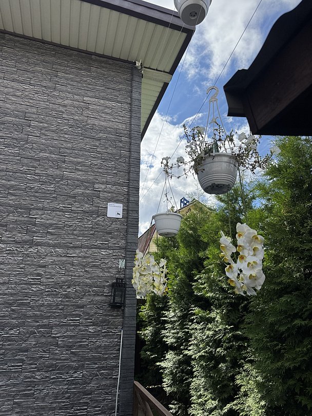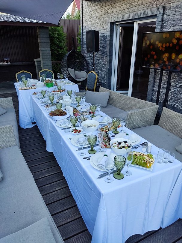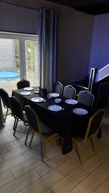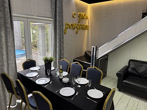 На территории организована крытая зона барбекю для приготовления блюд на гриле, есть просторная парковка с навесом на четыре автомобиля. В распоряжении гостей круглогодичный тёплый бассейн, русская баня на дровах с традиционным парением и закрытая охраняемая территория с атмосферой спокойствия и приватности.